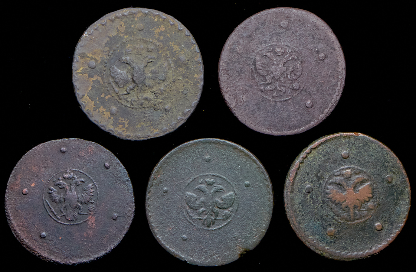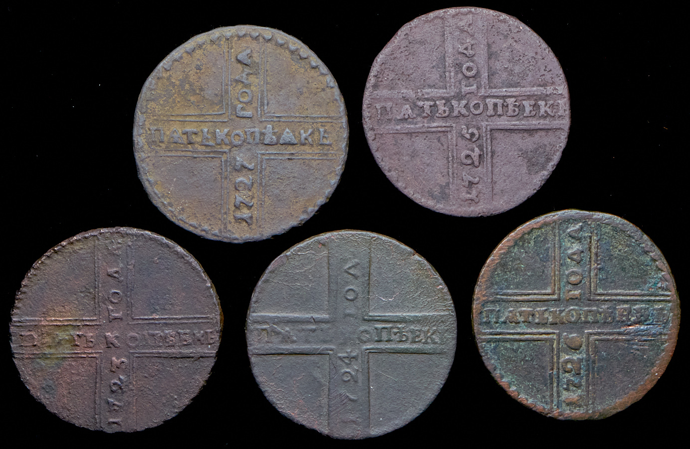 Набор из 5 "крестовых" 5 копеек 1723-1727
