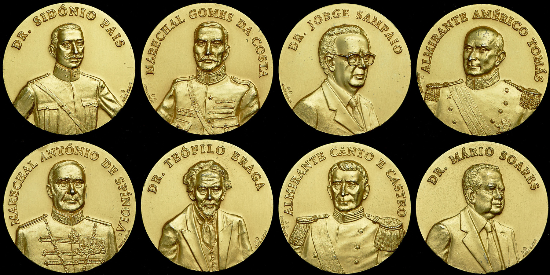 1) Настольная медаль "В честь 1-го президента Португалии Мануэля ди Арриага". Л.ст.: "Подпись медальера справа внизу "Jorge Coelho". Неизвестная мастерская, Португалия, 1990-е гг. Серебро, золочение, 64,72 гр. Диаметр 50 мм. Клейма справа внизу: пробирное голова птицы влево и "925" и мастерской неразборчиво. На гурте клеймо 26\200.