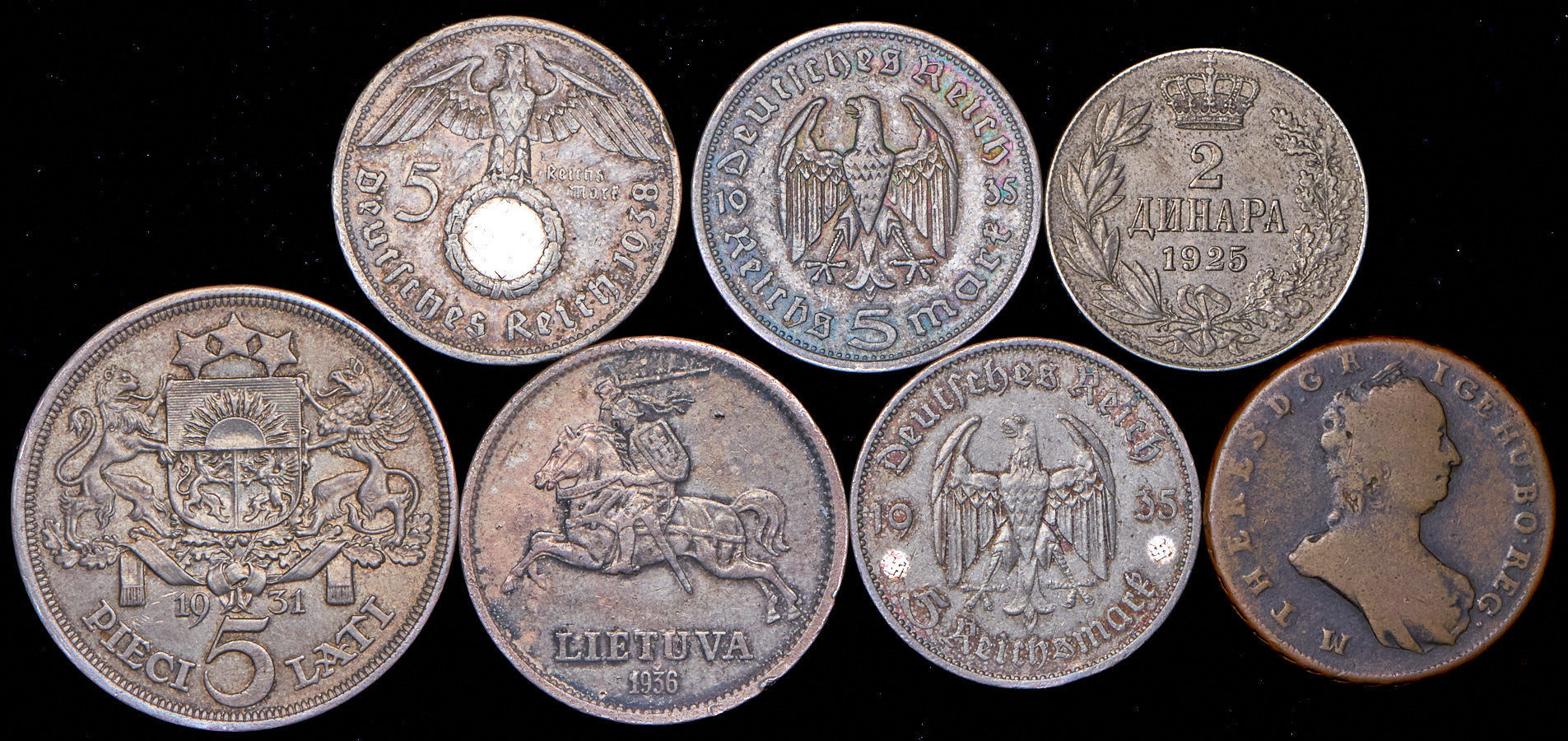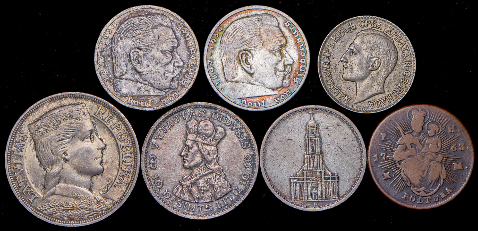 5 лат 1931; 10 лит 1936; 5 марок 1935; 5 марок 1938; 5 марок 1935; 2 динара 1925; полтура 1763.