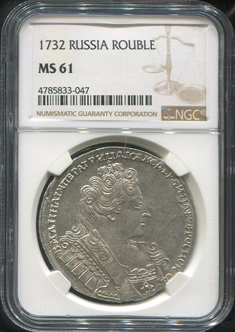Тип 1731-1733 годов, т.н. "Портрет с локоном за ухом, с брошью на груди". Корона с крестом.