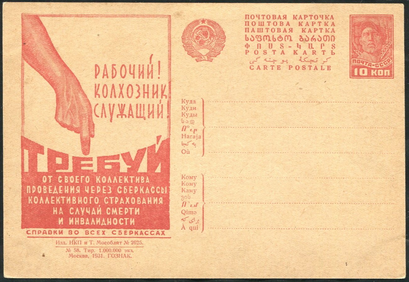 Агитационная открытка СССР 1930-х годов "Рабочий! Колхозник! Служащий! Требуй от своего коллектива проведения через сберкассы коллективного страхования на случай смерти и инвалидности".