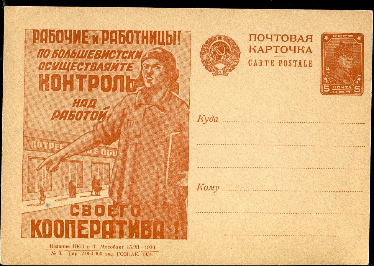 Открытка "Рабочие и работницы по большевистски осуществляйте контроль над работой своего кооператива" 1931
