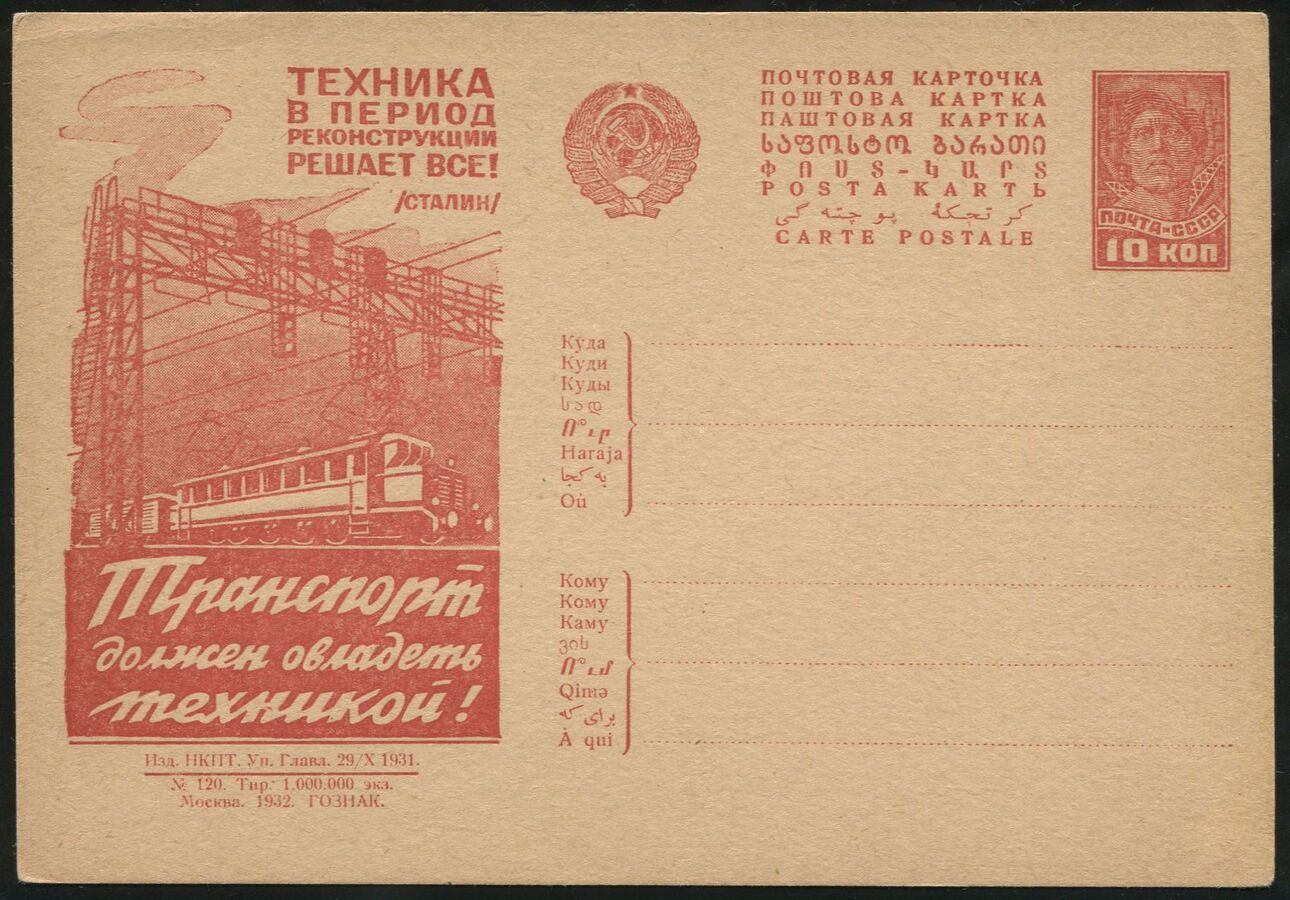 Открытка "Техника в период реконструкции решает все" 1932