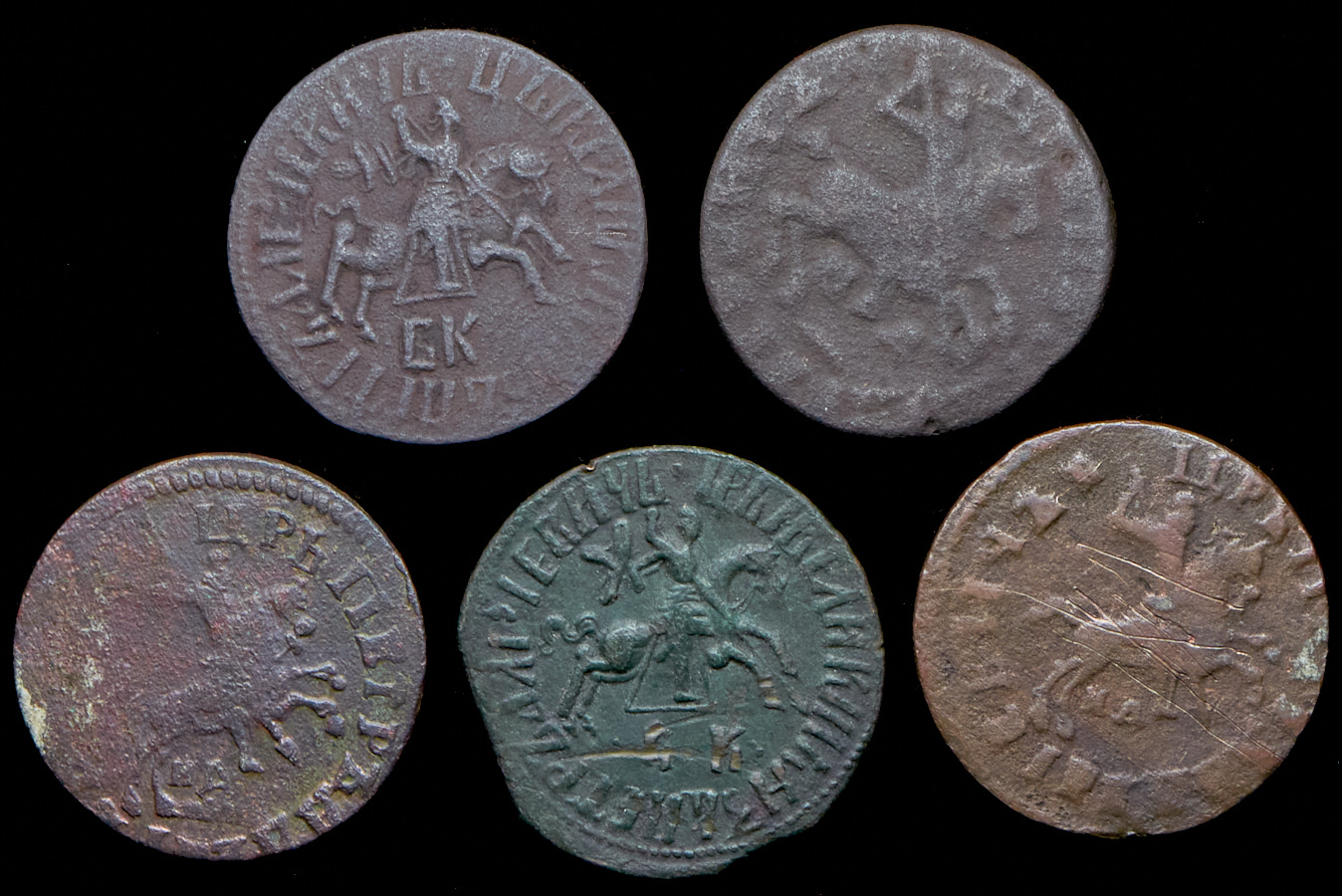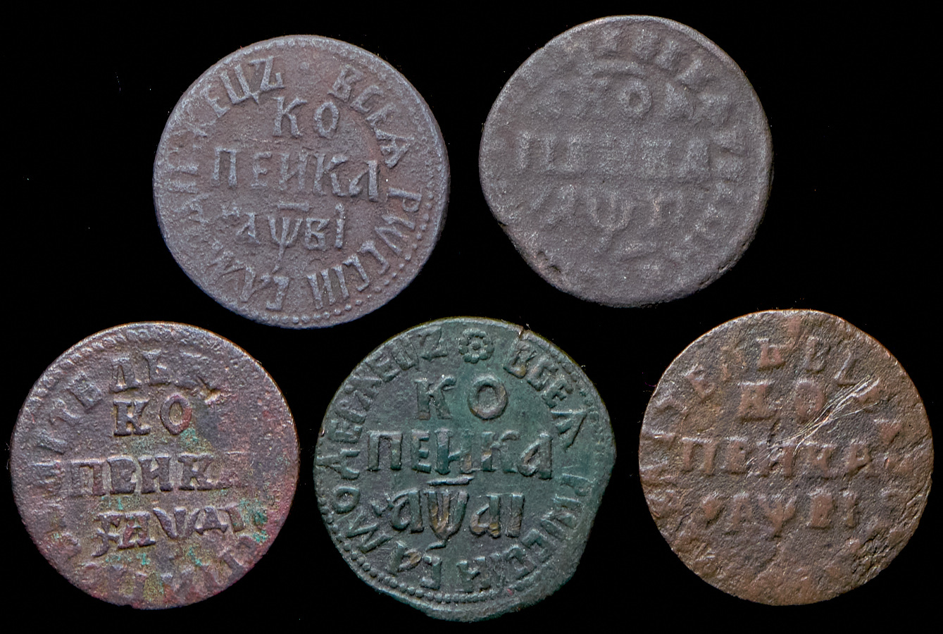Набор из 5 медных монет Копейка 1710-е (Петр I)