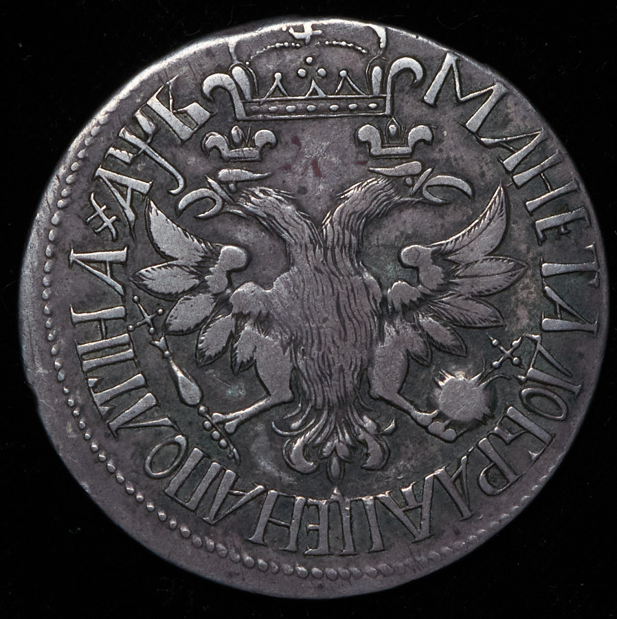 Орел образца 1702 года. Центральная корона большая, закрытая, с крестом, с верхними дугами. Без остей между перьев на крыльях орла. Скипетр с крестом. Крест на державе украшенный.