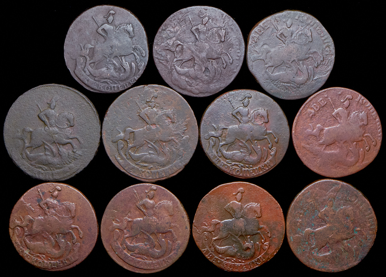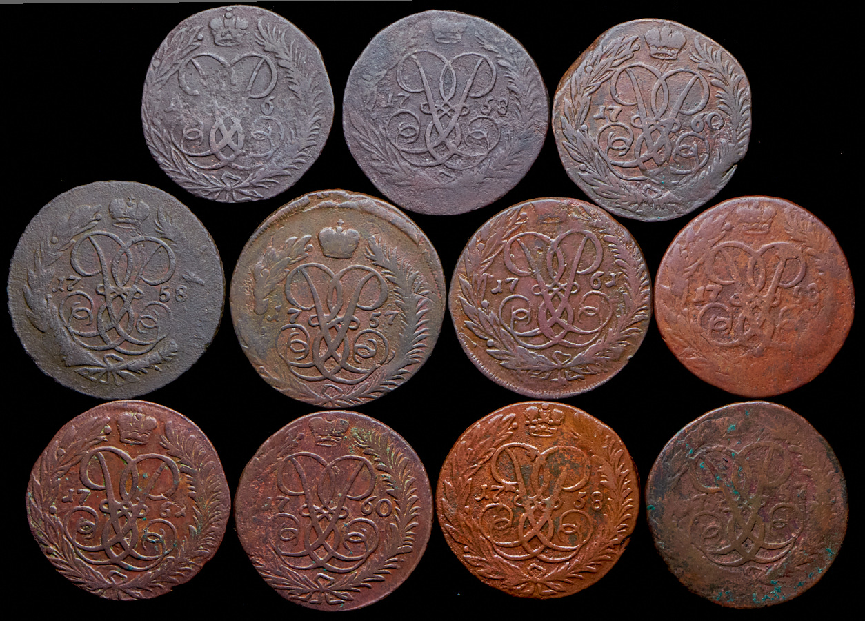 Набор из 11 медных монет 2 копейки (Елизавета Петровна)