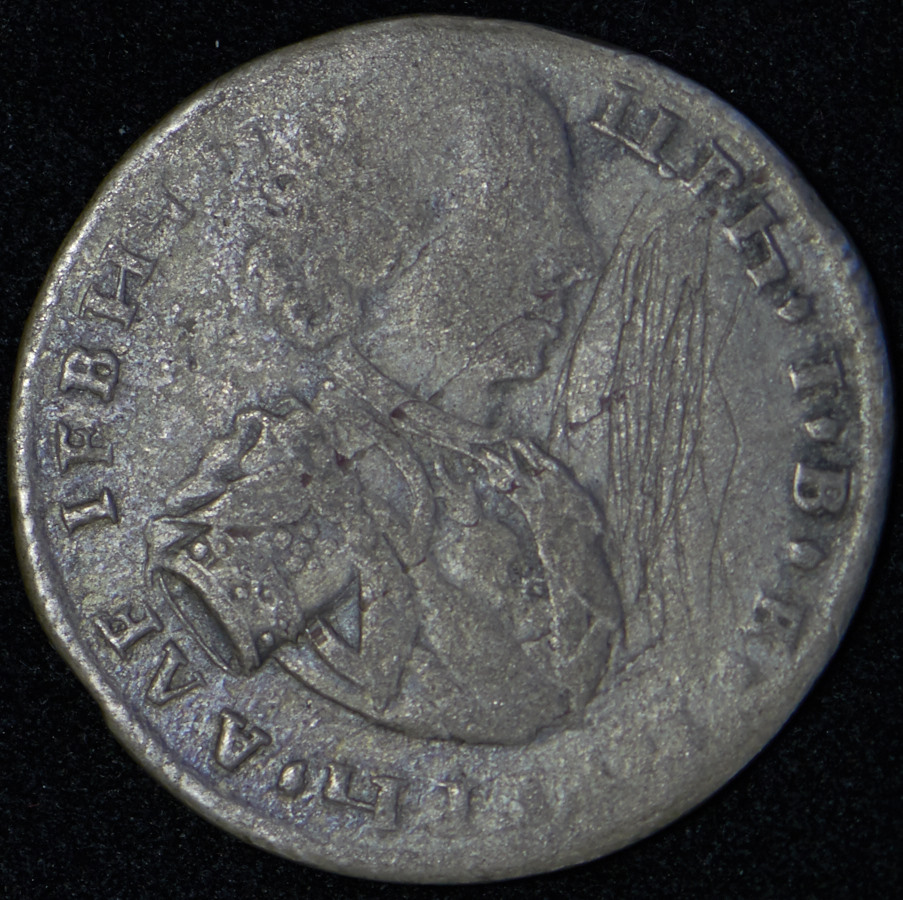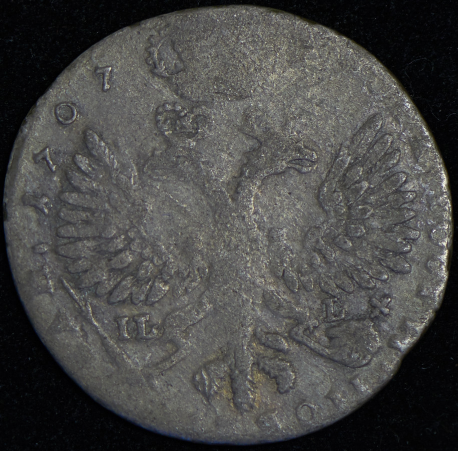 Следы местной чистки на поле аверса. Кадашевский монетный двор. Дата обозначена арабскими цифрами. Малая голова. Легенда аверса разделена коронами. Легенда реверса разделена маленькими овалами. Корона большая.