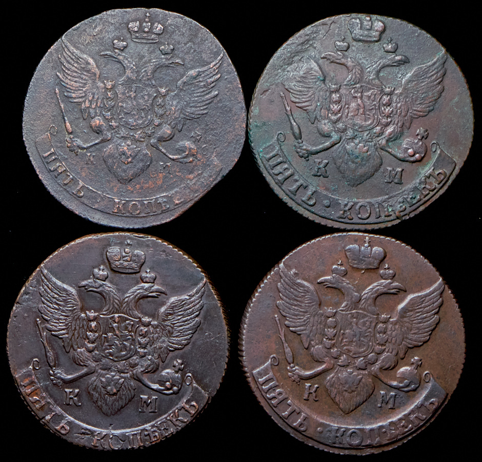 Набор из 4 медных монет 5 копеек 1788-1795 (Екатерина II)