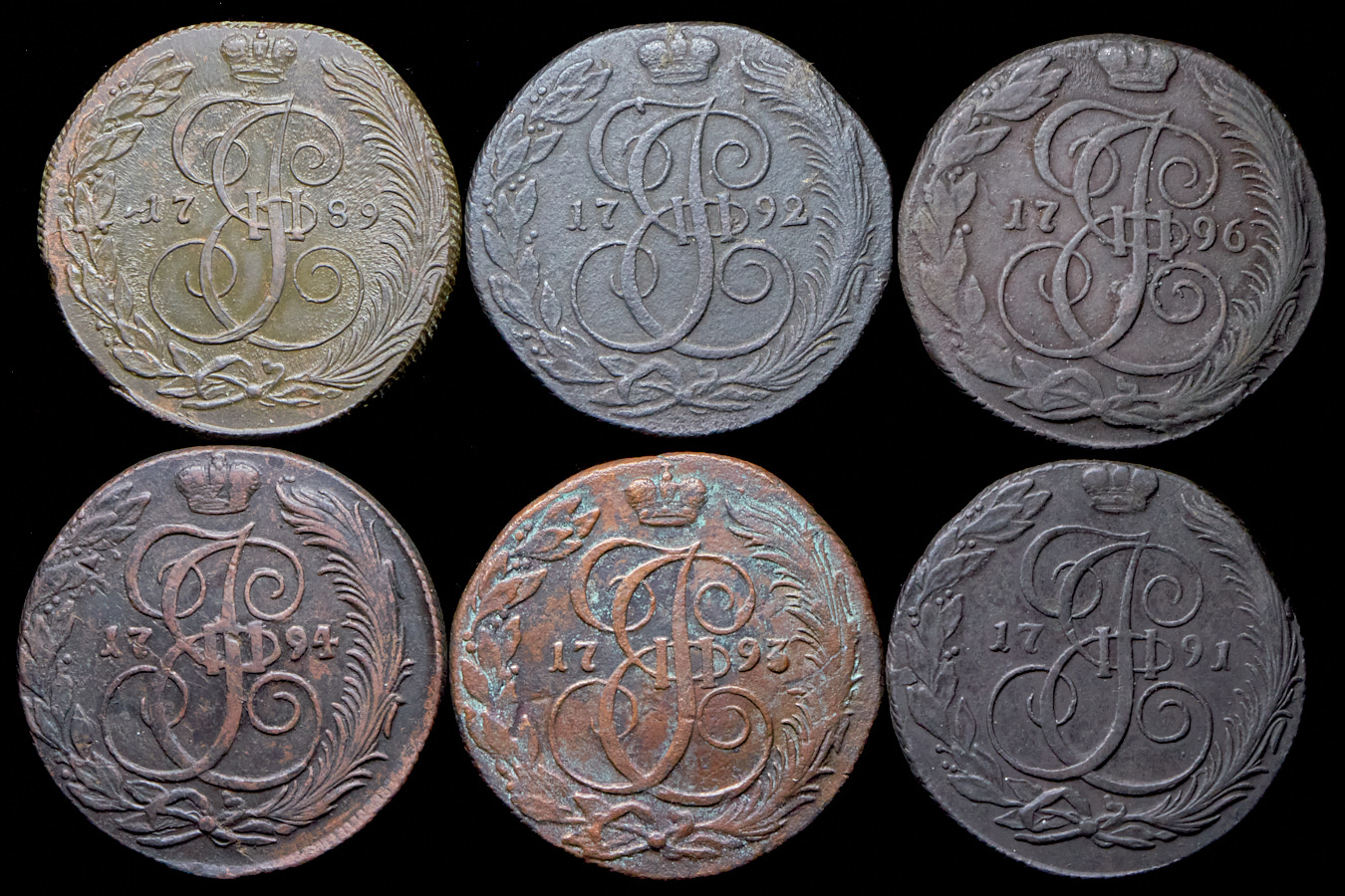 Набор из 6 медных монет 5 копеек 1789-1796 (Екатерина II) КМ