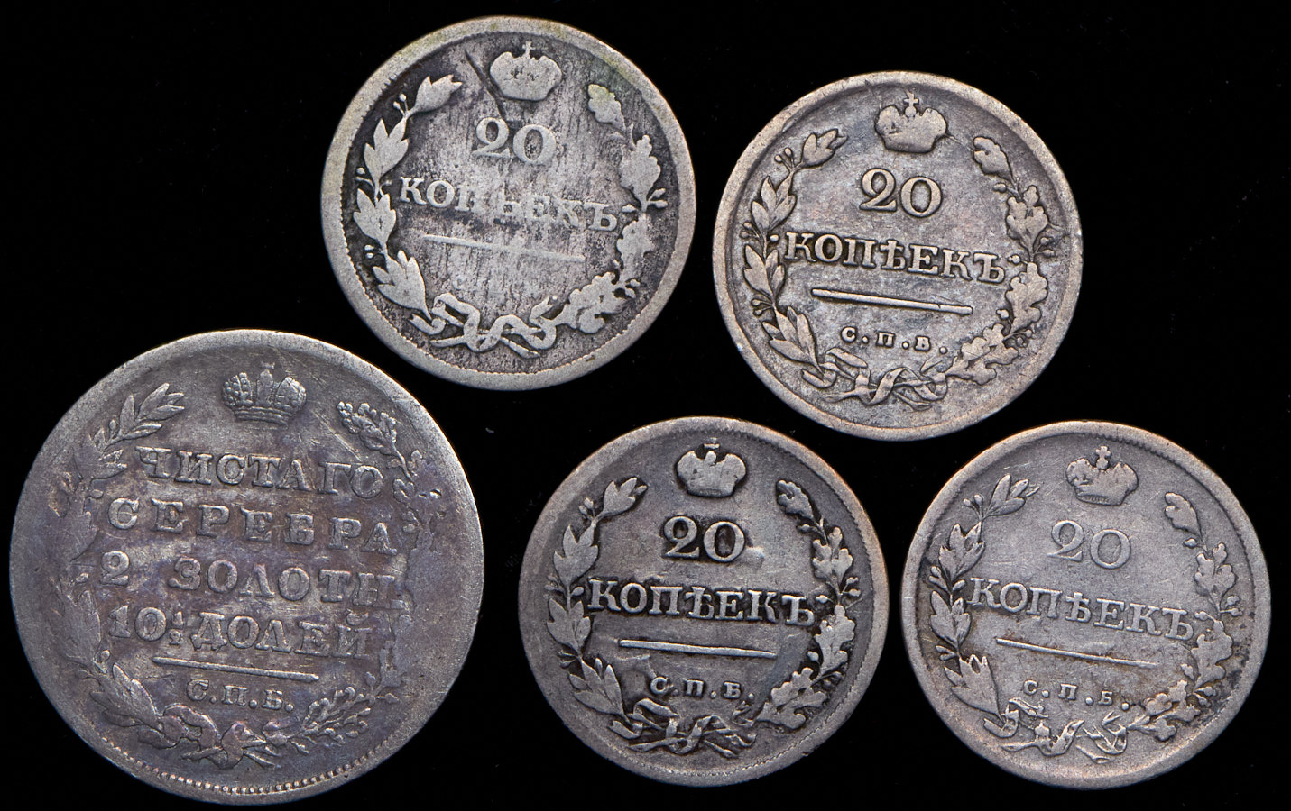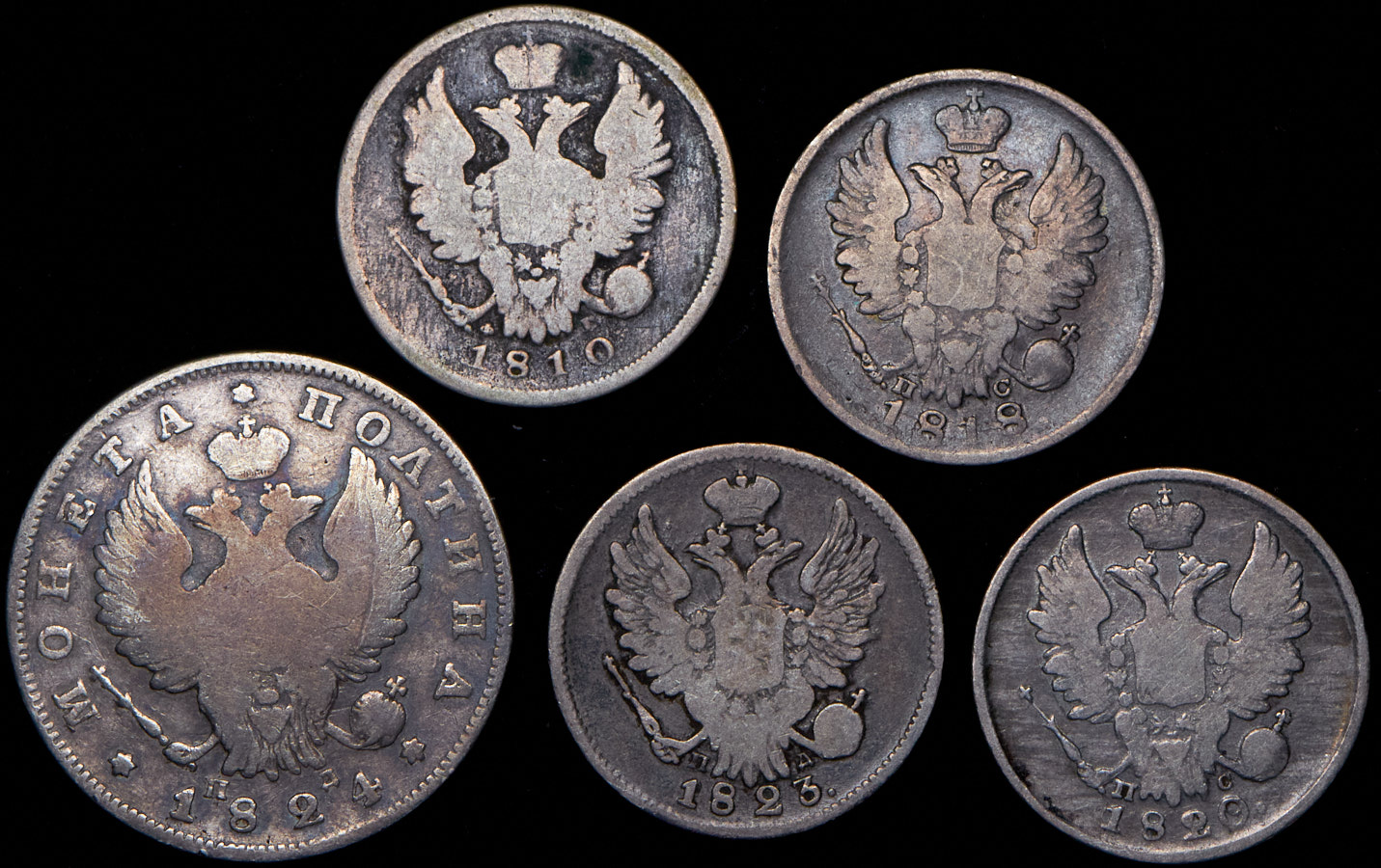 G-VG.Полтина 1824, 20 копеек 1810, 1818, 1820, 1823.