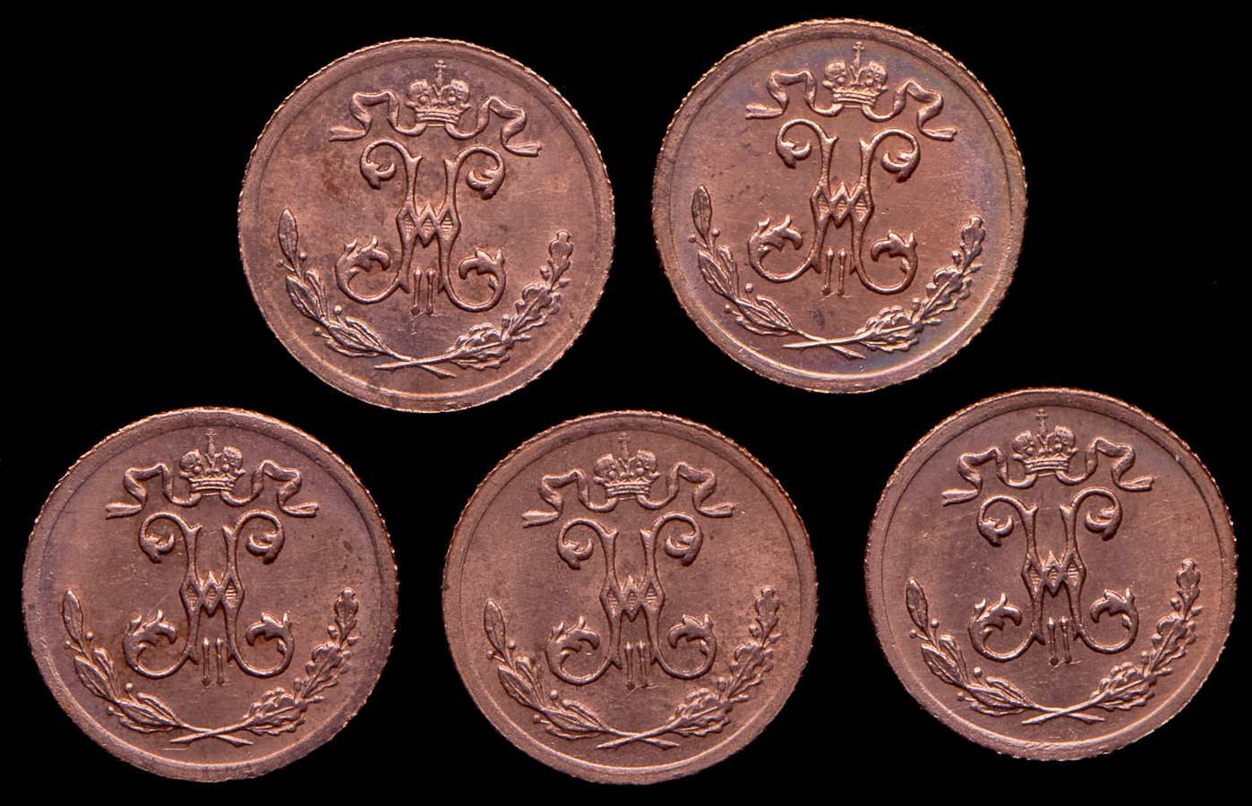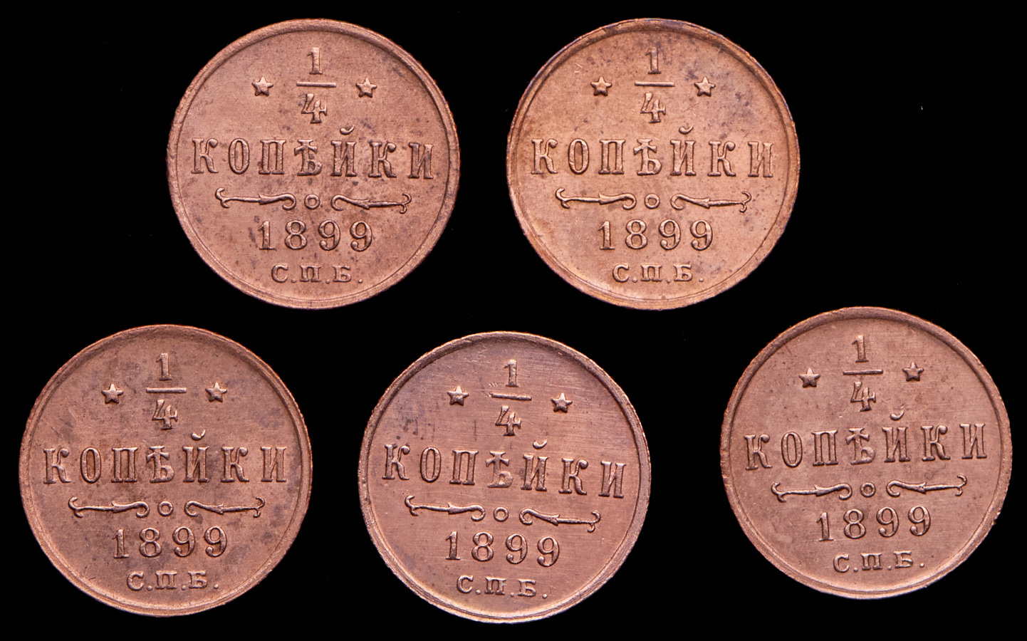 Набор из 5 медных монет 1/4 копейки 1899 СПБ