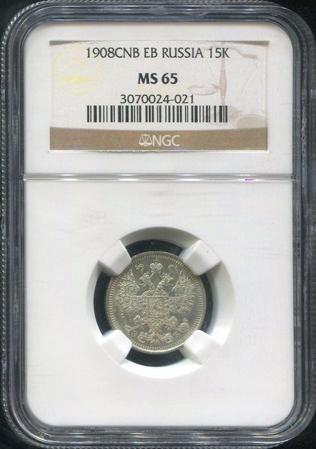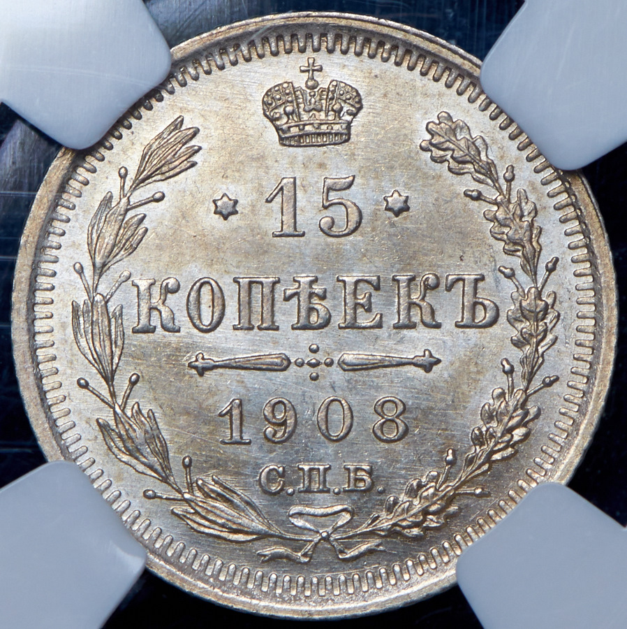 15 копеек 1908 (в слабе) СПБ-ЭБ
