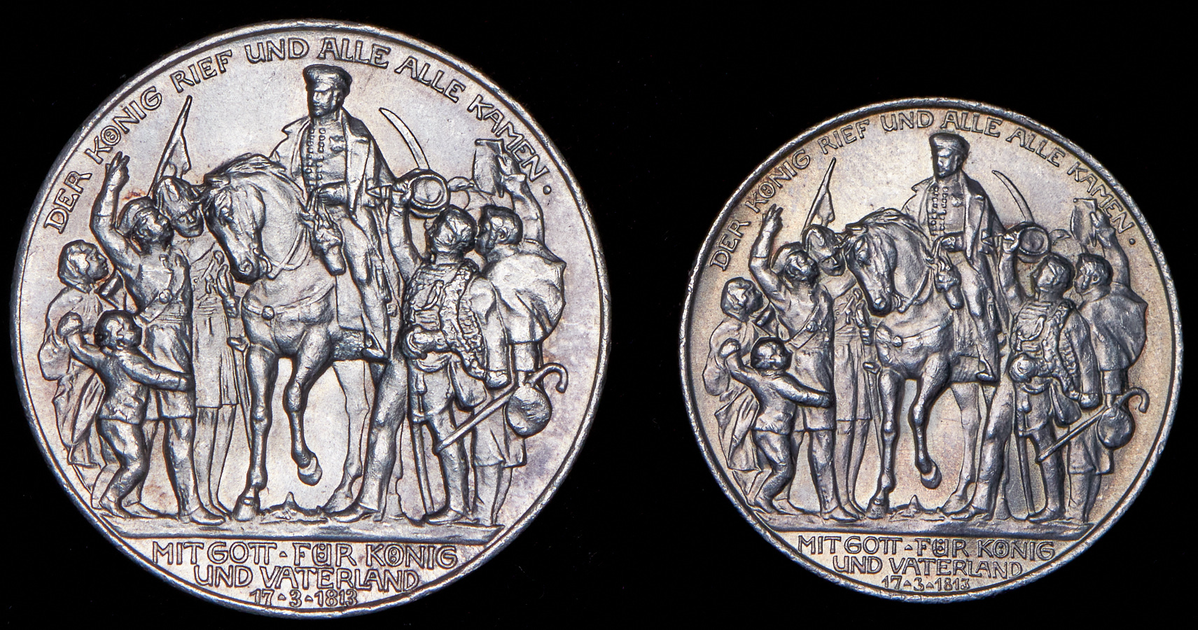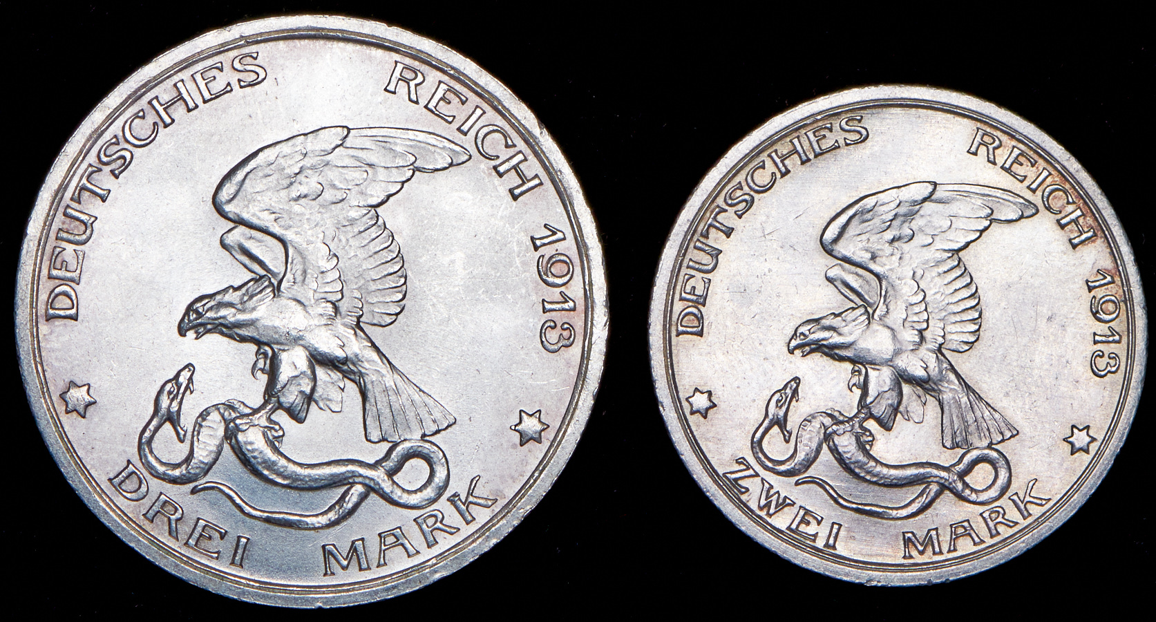 Набор из 2 сер. монет 2, 3 марки 1913 "100-летие победы над Наполеоном" (Пруссия)