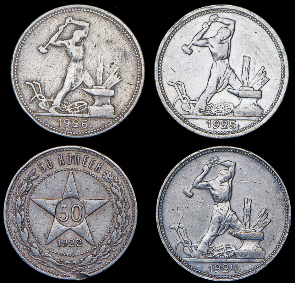 VF-XF. 50 копеек 1922, полтинник 1924, полтинник 1925, полтинник 1926.