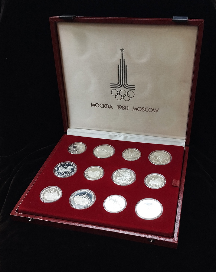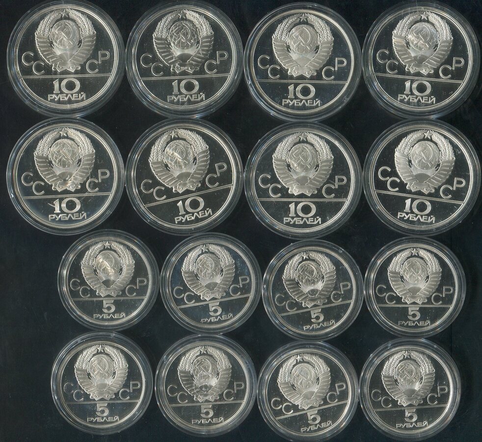 Набор серебряных монет номиналом 10 и 5 рублей, выпущенных к XXII Олимпийским играм 1980 года в Москве. В подарочной коробке. Каждого номинала по 14 шт.