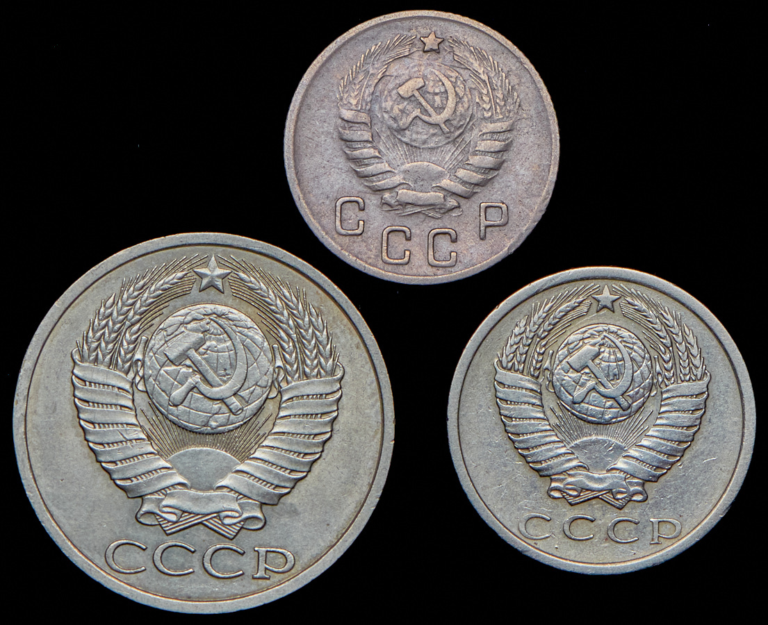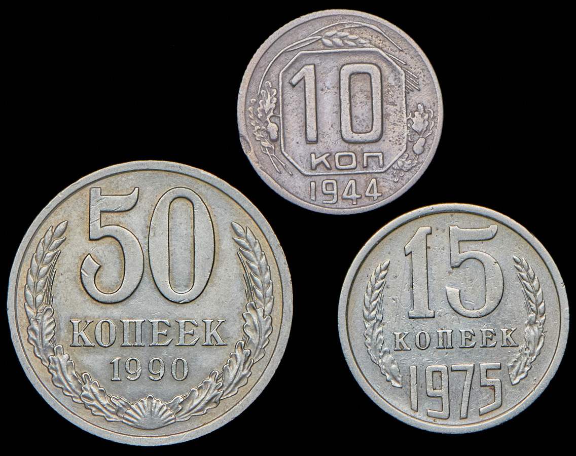 XF-MS. 50 копеек 1990 (гурт 1990 года), 15 копеек 1975, 10 копеек 1944