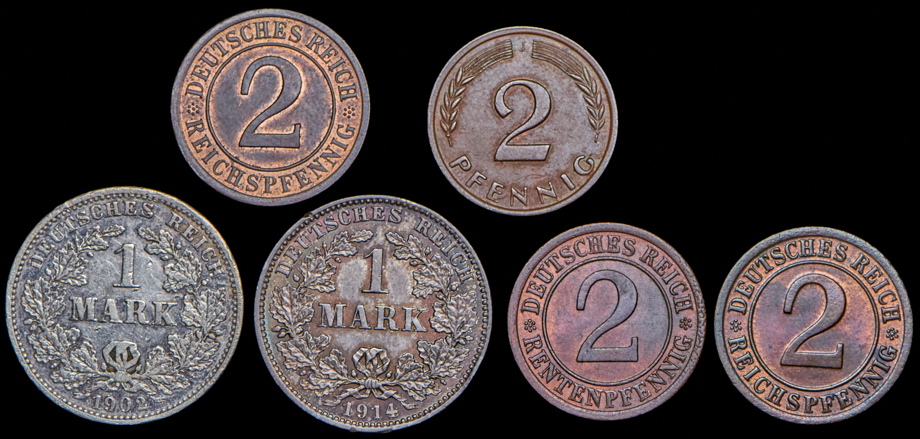 XF-AU. 2 пфеннинга 1923; 2 пфеннинга 1924; 2 пфеннинга 1925; 2 пфеннинга 1950; 1 марка 1902; 1 марка 1914.