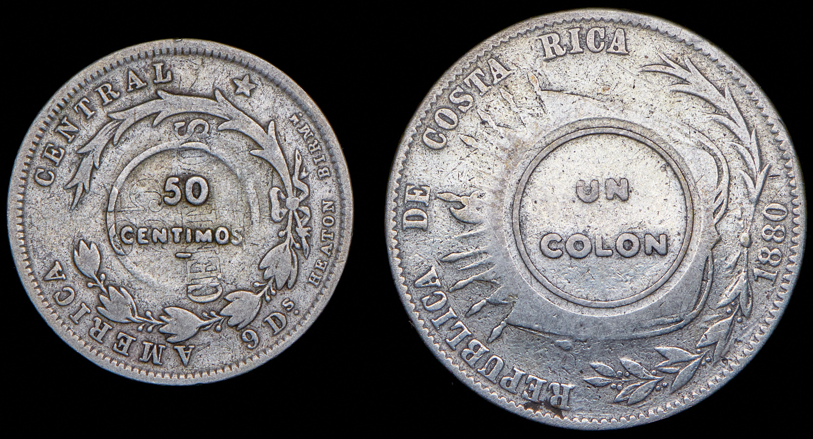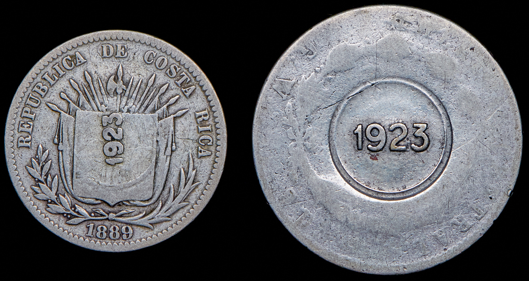 G-VG. 50 сентимо 1923 г.¶1 колон 1923 г.¶С центровыми надчеканами.