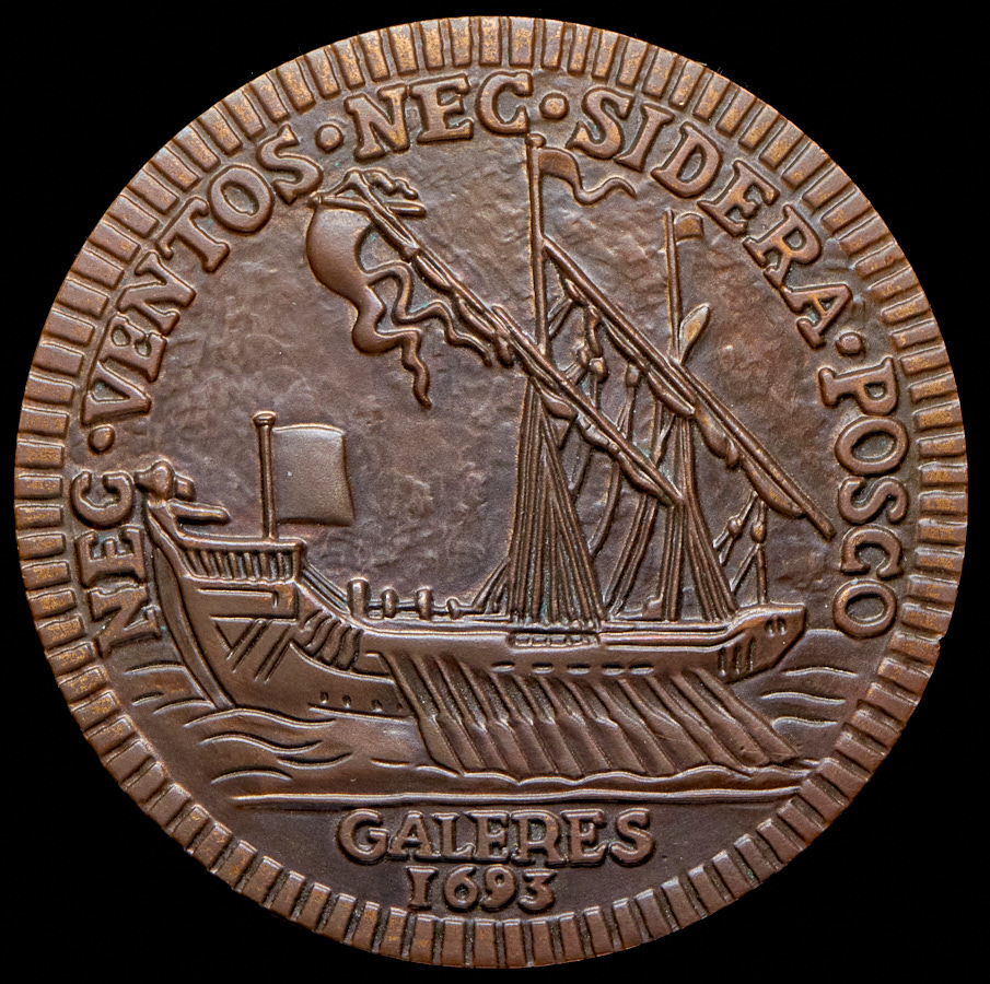 На обороте по кругу надпись (на латыни): Здесь нет ни ветров, ни звезд. «Nec ventos nec sidera posco. Galeras 1693».