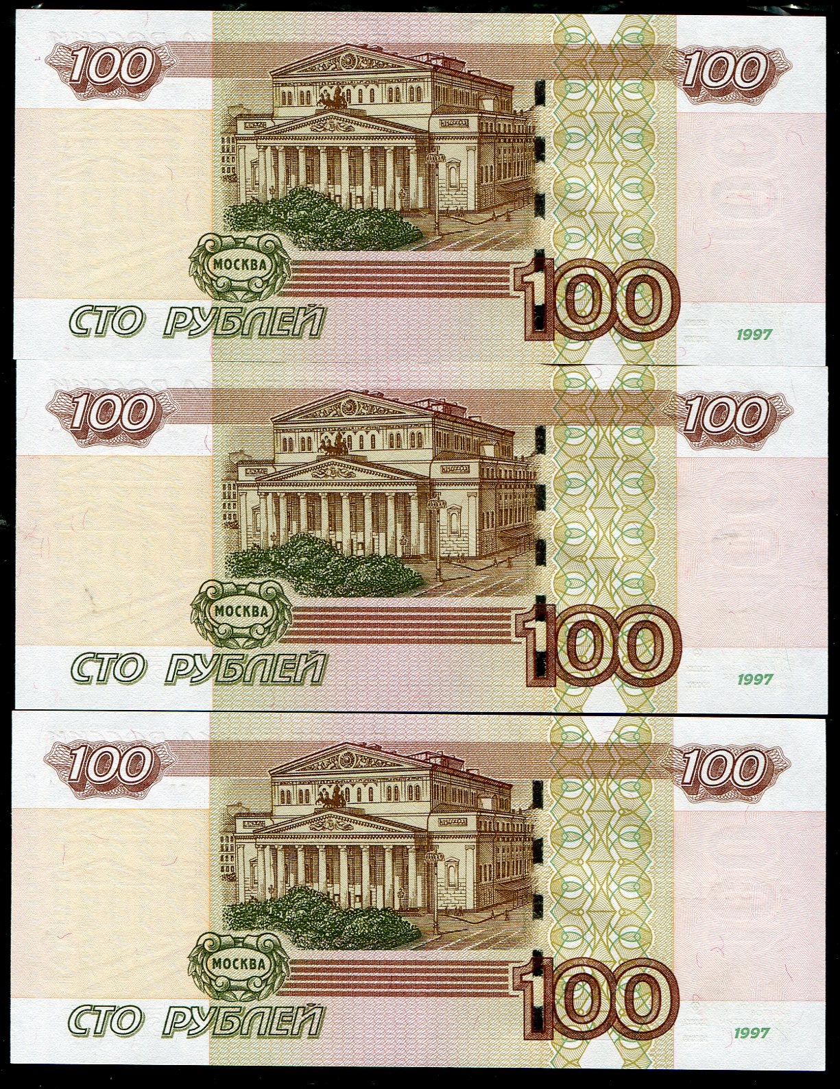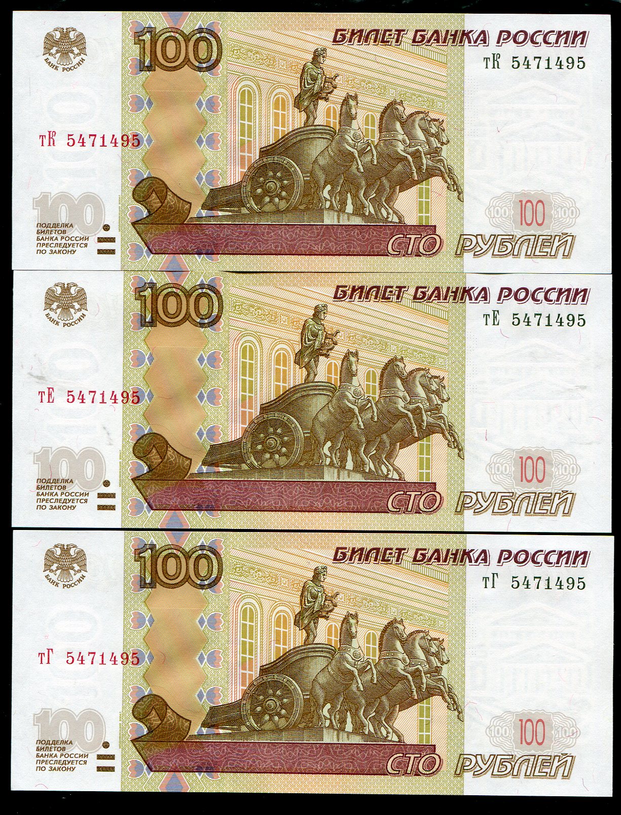 Набор из 3-х бон 100 рублей 1997 года, модификация 2004 года. Одинаковые номера тК 5471495.