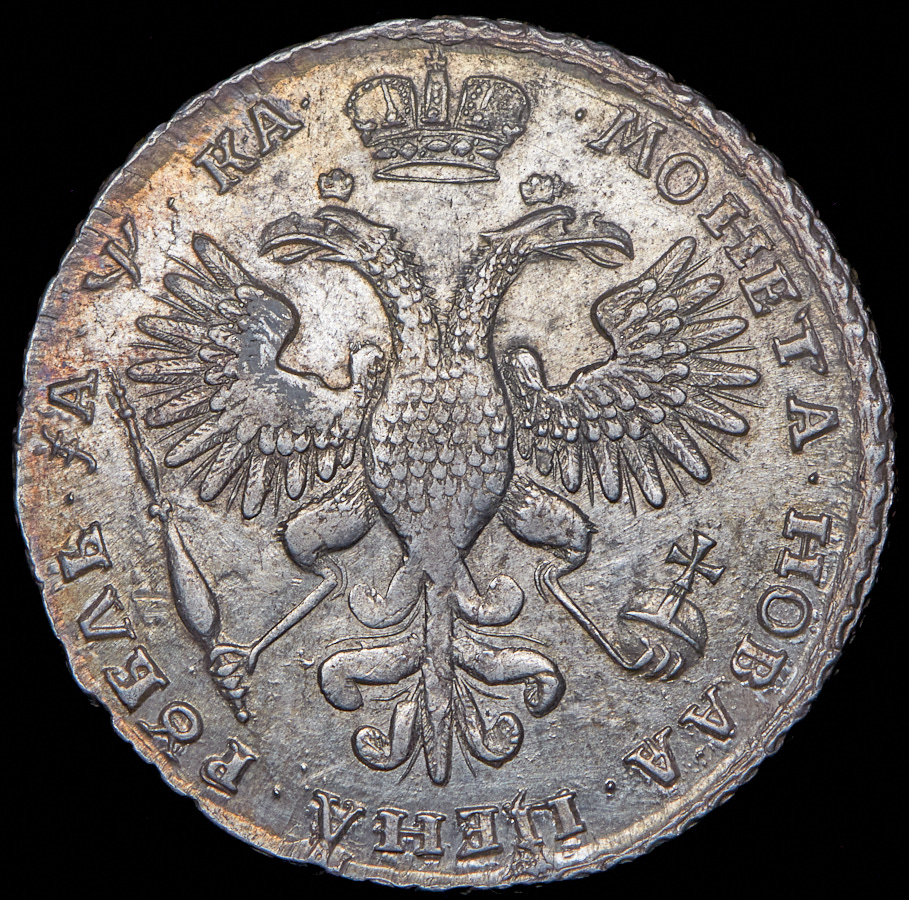 Кадашевский монетный двор. Тип 1720-1721 гг. Портрет в супервесте. Большая розетка над головой, инициал медальера "К". С пальмовой ветвью на груди.