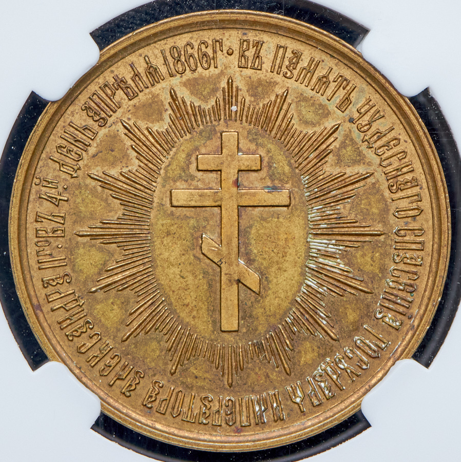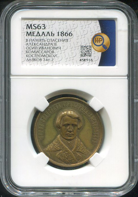 Ещё была учреждена золотая Медаль «4 апреля 1866 года». 8 апреля 1866 года эта медаль в единственном экземпляре была отчеканена на С.-Петербургском монетном дворе и вручена крестьянину Костромской губернии Осипу Ивановичу Комиссарову, спасшему Императора от выстрела покушавшегося на него Каракозова.