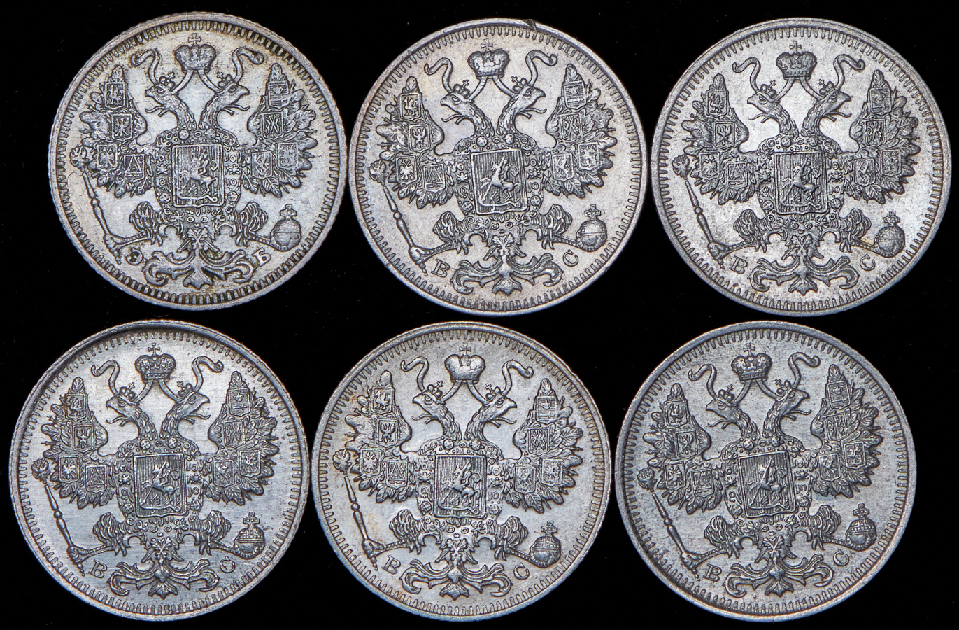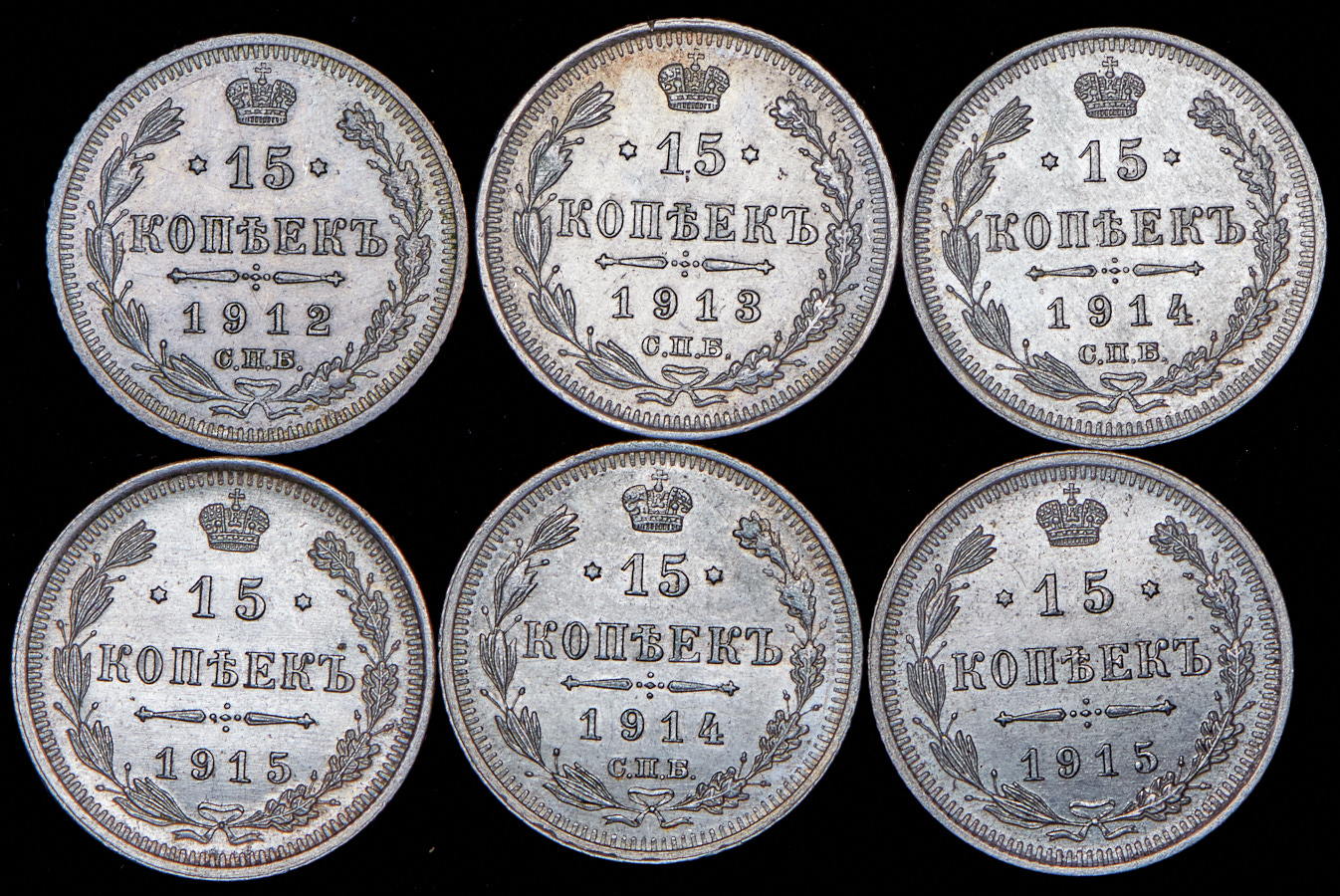 Набор из 6 сер. монет 15 копеек 1912-1915