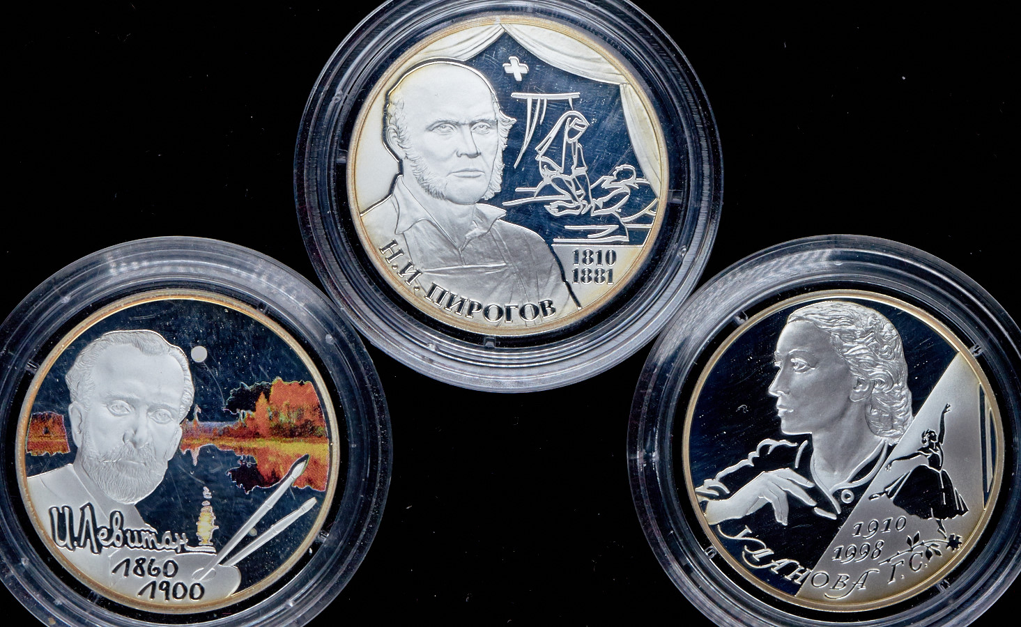 Серебро 925 пробы. 2 рубля 2010 года "Уланова Г.С., 100 лет со дня рождения" 2 рубля 2010 года "Левитан И.И., 150 лет со дня рождения" 2 рубля 2010 года "Пирогов Н.И., 200 лет со дня рождения"