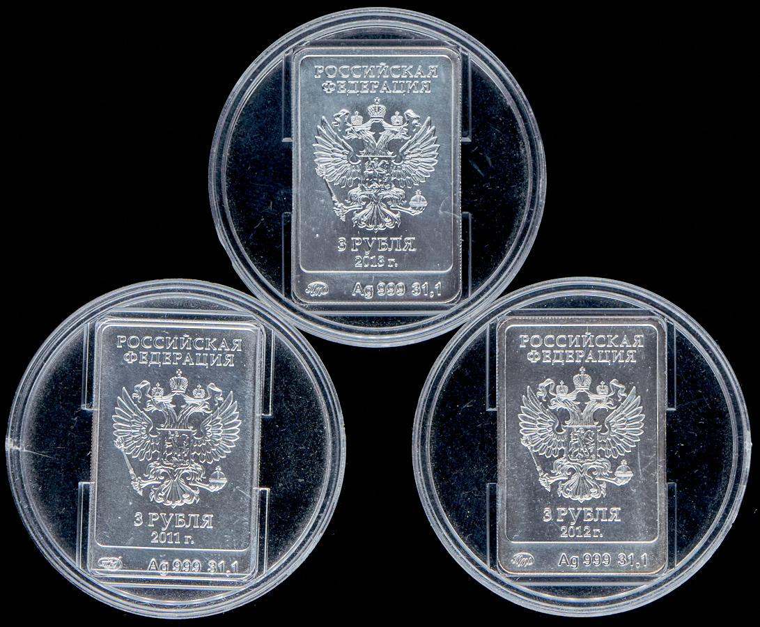 3 прямоугольных монеты MS из серебра 999 пробы.