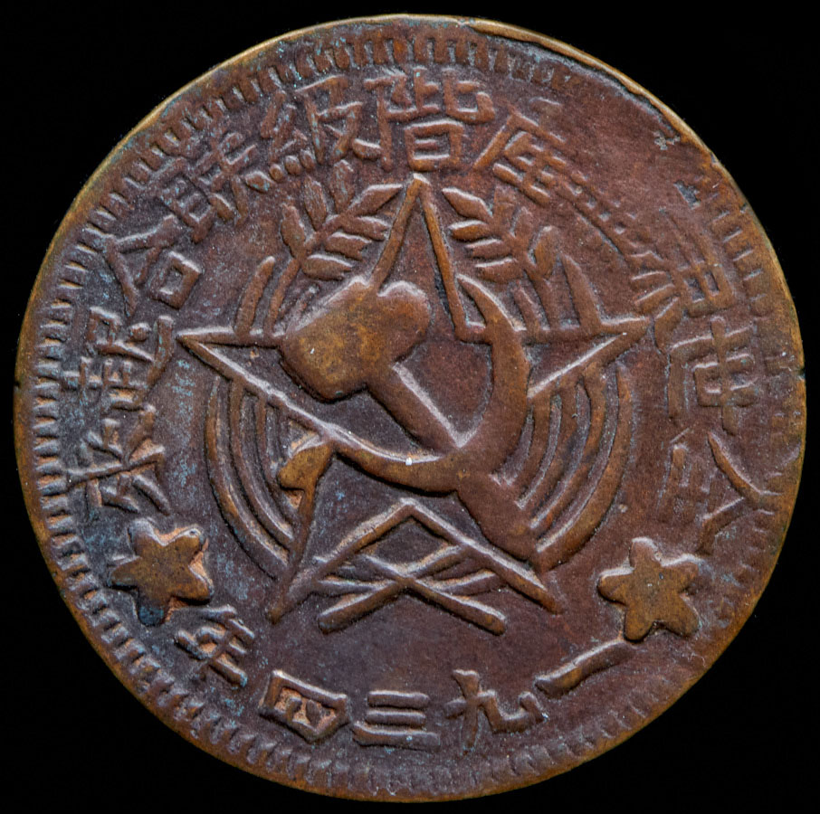 Медь. На аверсе — крупные звезды по бокам от даты, рукоятка молота пересекает нижнюю грань звезды. Редкая эмиссия периода китайских советов.