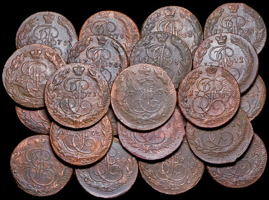 Набор из 22 медных монет 5 копеек 1763 - 1788