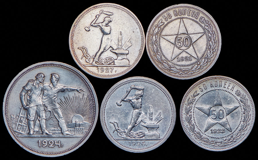 XF-AU Рубль 1924, 50 копеек 1921 (АГ) 50 копеек 1922 (ПЛ) Полтинник 1926 (ПЛ) Полтинник 1927 (ПЛ)