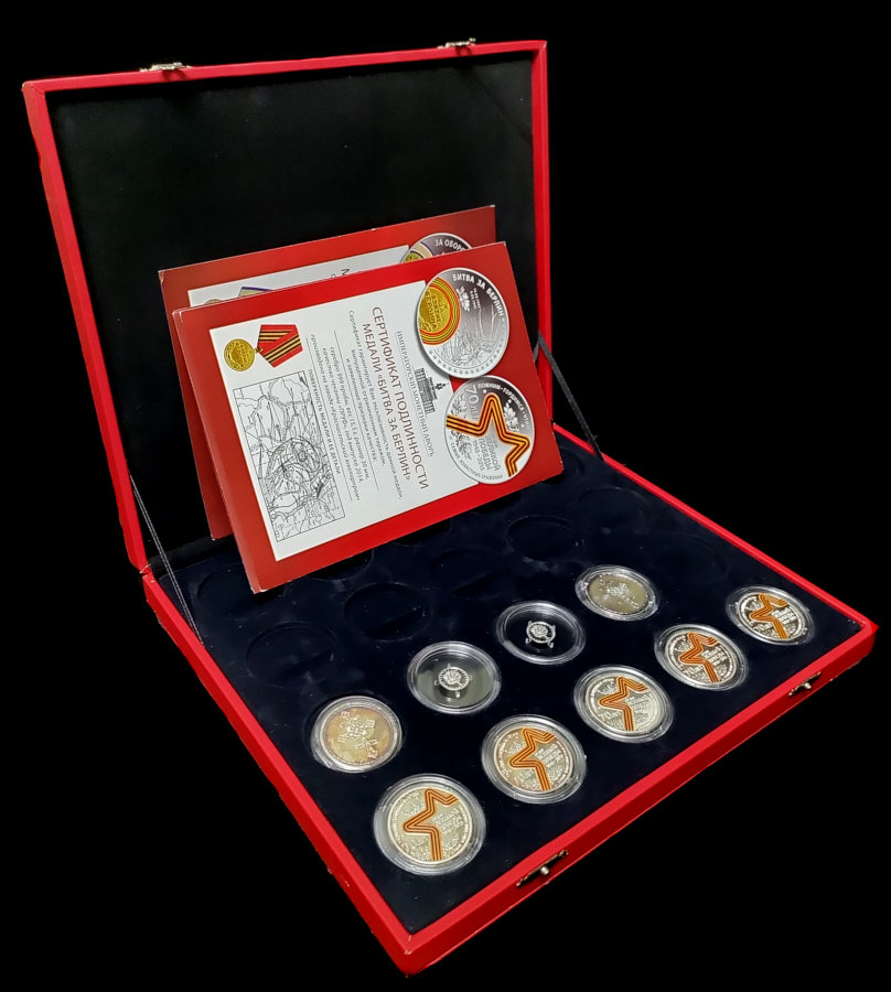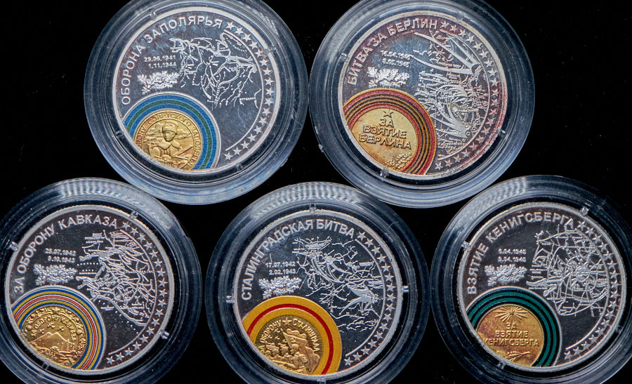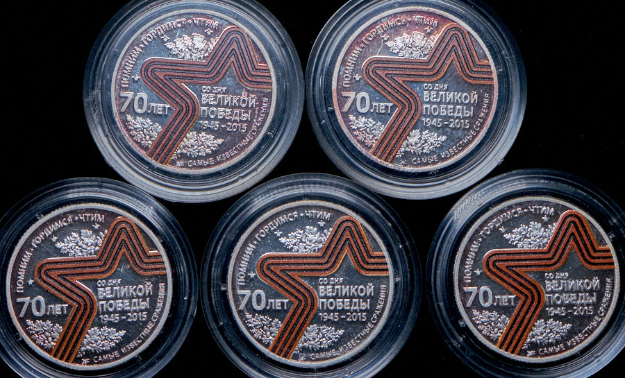 1) Медали в честь 70-летнего юбилея Победы в Великой Отечественной Войне (5 шт.). Императорский монетный двор. Диаметр: 33 мм. Вес: 15,5 г. Серебро 999. Тираж: 5000 экз.