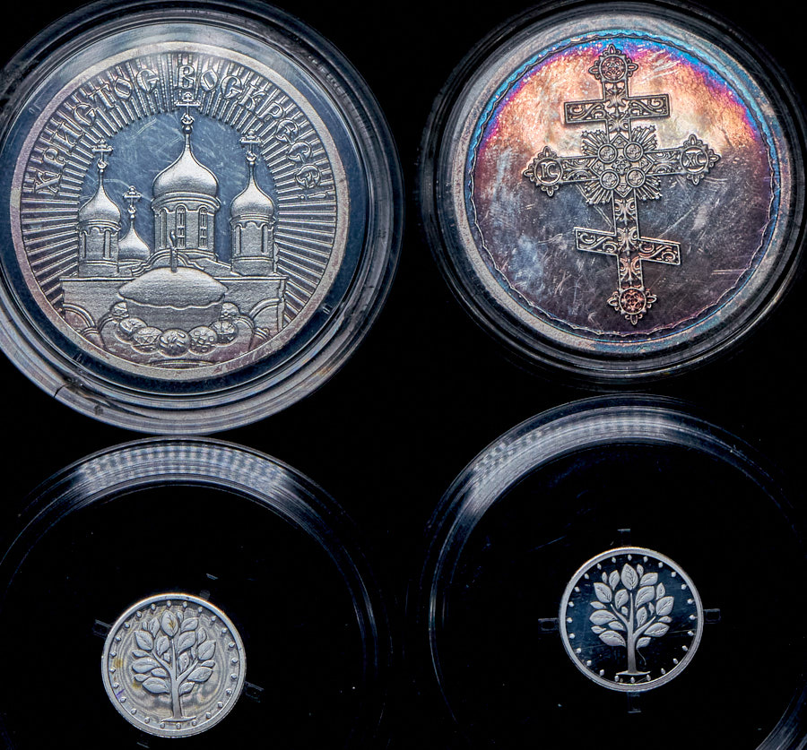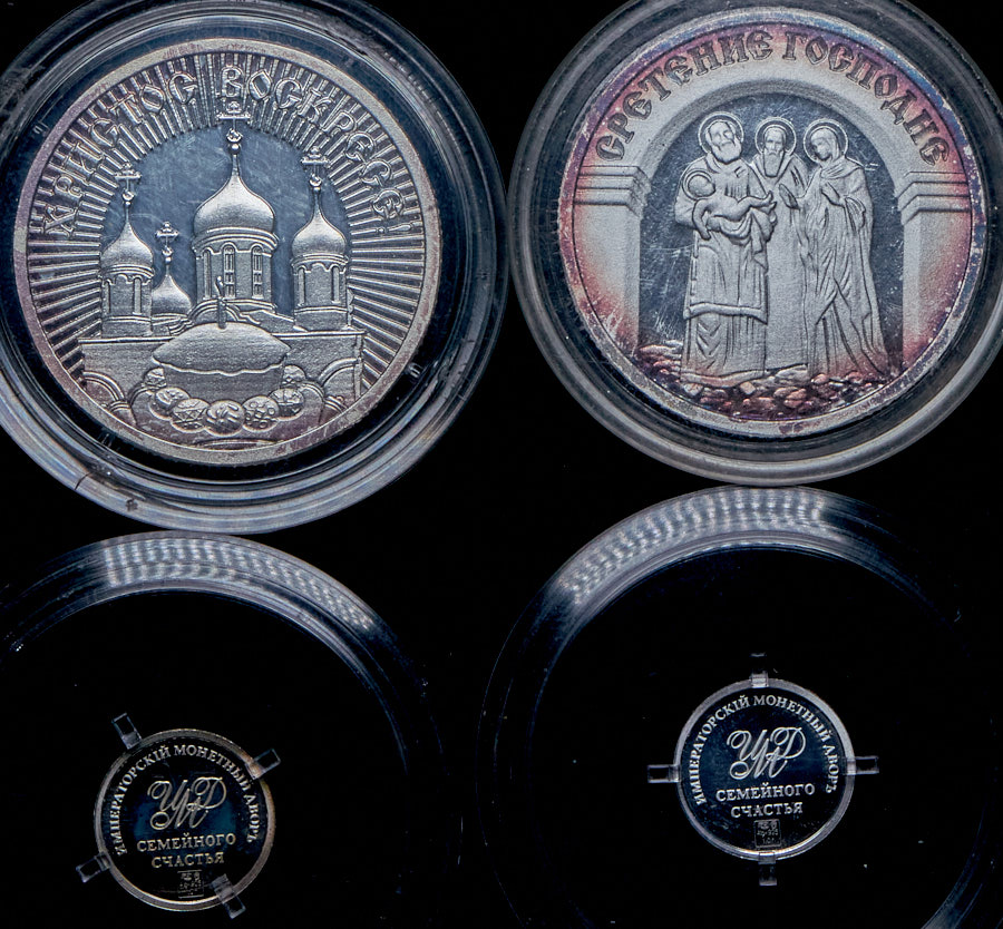 2) Жетоны "Православные праздники России" (2 шт.). Императорский монетный двор. Диаметр: 33 мм. Серебро 999. Вес: 15,5 г.