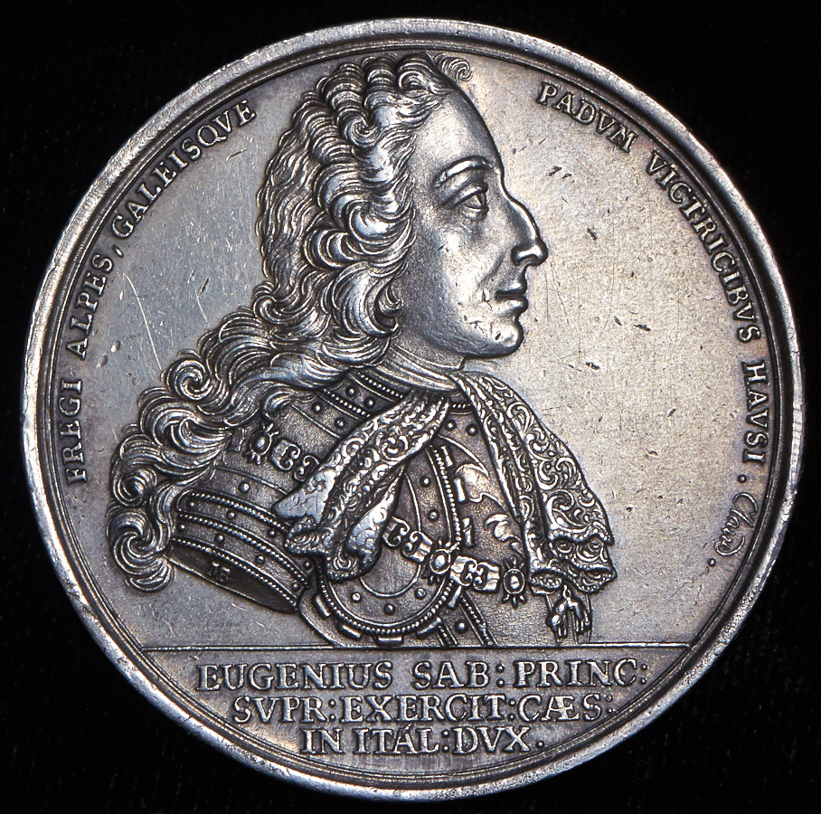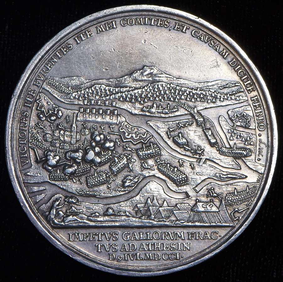 На аверсе медали изображение принца Евгения Савойского (1663-1736) в парадном облачении. На реверсе - изображение итальянского пейзажа с панорамой на реку Адидже (воссоздается победа принца Евгения Савойского над французами при Карпи и Кремоне).