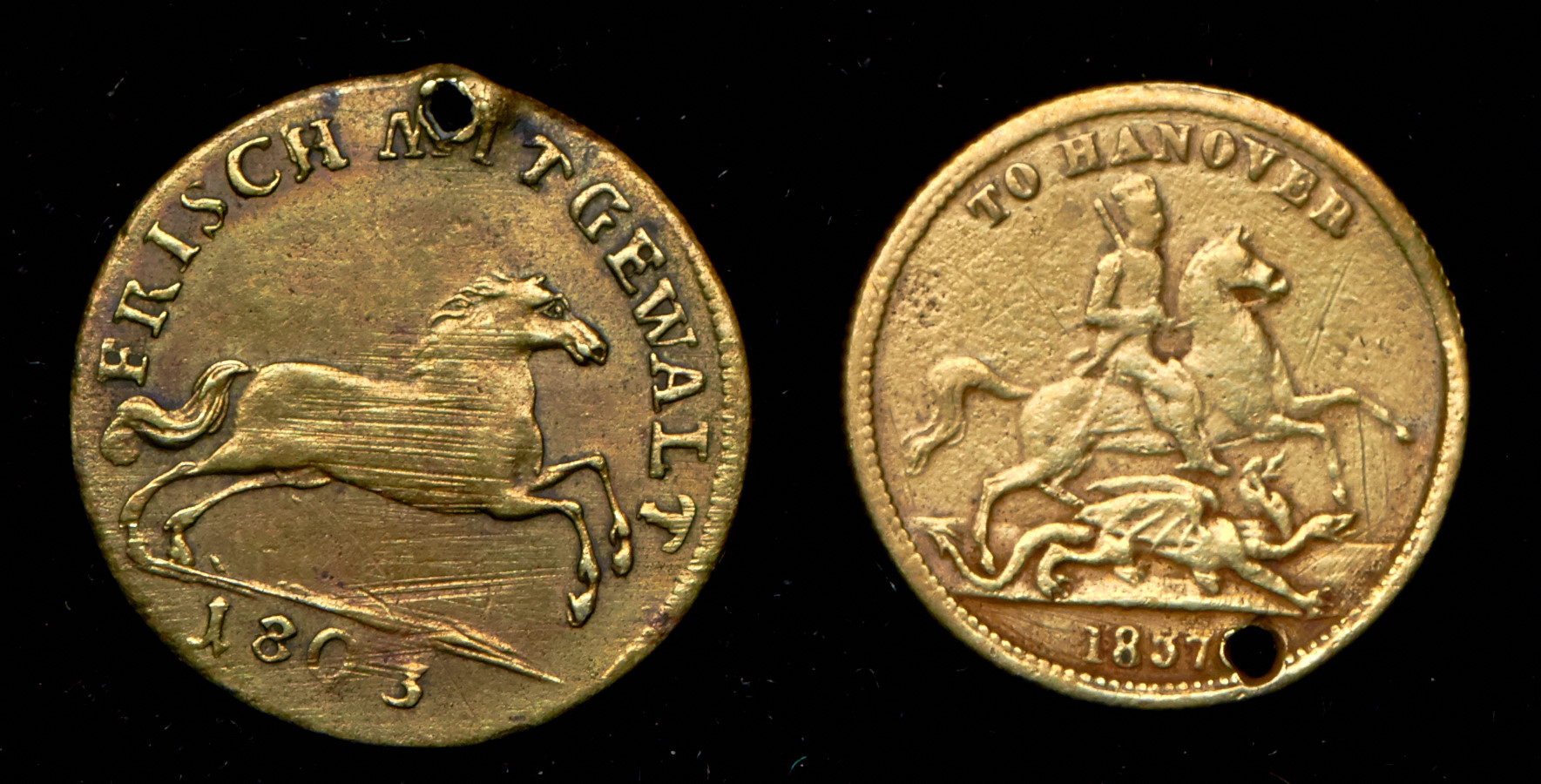 На лицевой стороне - портрет молодой Виктории. На оборотной стороне - герцог Кэмберлендский с шашкой наголо скачет в Ганновер.