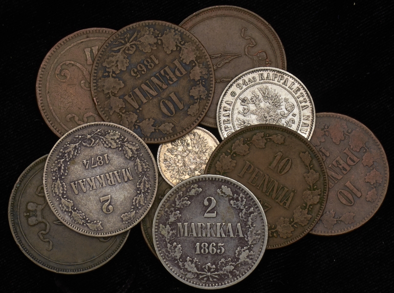 В набор вошли серебряные и медные монеты XIX-XX вв. для Финляндии. Сохранность VF-AU.