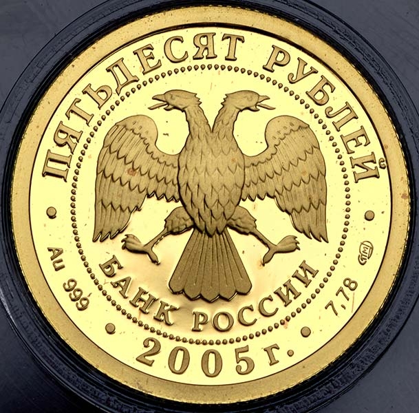 Аверс: Вверху вдоль канта номинал «ПЯТЬДЕСЯТ РУБЛЕЙ», внизу слева химическое название «Au» и проба «999» металла, внизу по центру год выпуска «2005 г.», внизу справа чистый вес находящегося в монете драгоценного металла «7,78» и монограмма монетного двора «СПМД». В середине в ободке из точек двуглавый орел под ним с внутренней стороны точечного ободка слова «БАНК РОССИИ».