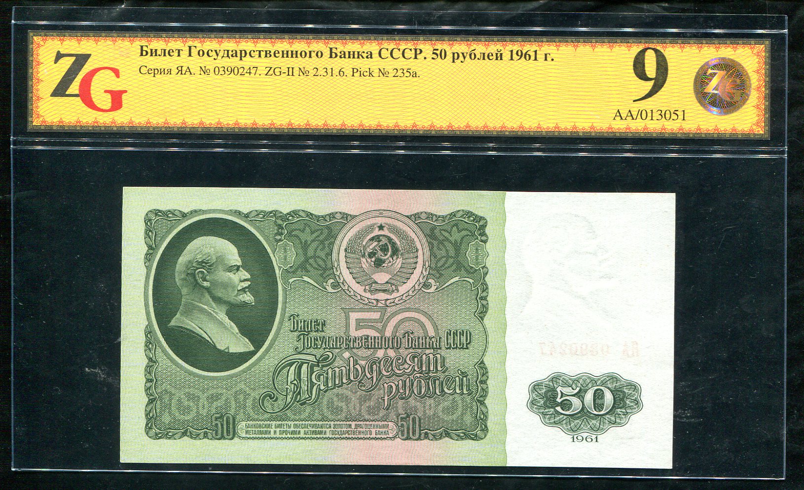 P# 235a. Билет Государственного Банка СССР 50 рублей образца 1961 года. Серия замещения ЯА 0390247. В слабе ZG AU 58.