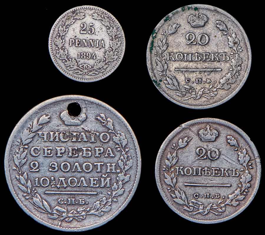 VG-F Полтина 1817, 20 копеек 1822, 20 копеек 1818, 25 пенни 1894
