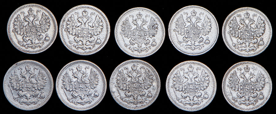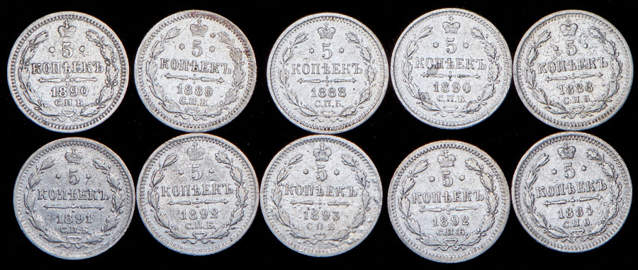 Набор из 10 сер. монет 5 копеек (XIX век)