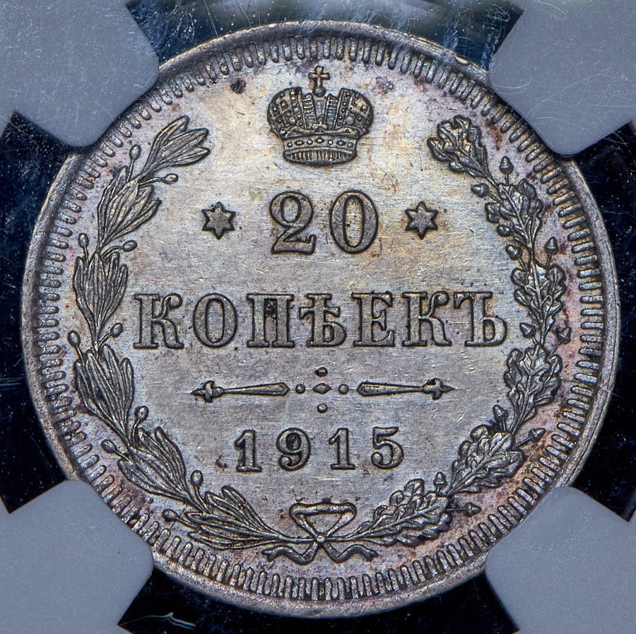 "После начала первой мировой войны, в которой противником России была германия, русской столице в 1915 г. вместо "немецкого" названия - Санкт-Петербург - было присвоено русское - Петроград. В связи с этим со всех русских монет (разменных серебряных и медных) было снято обозначение Петербургского монетного двора - "СПБ" (т.е. "Санкт-Петербург"), однако другого обозначения до 1917 г. так и не было установлено."