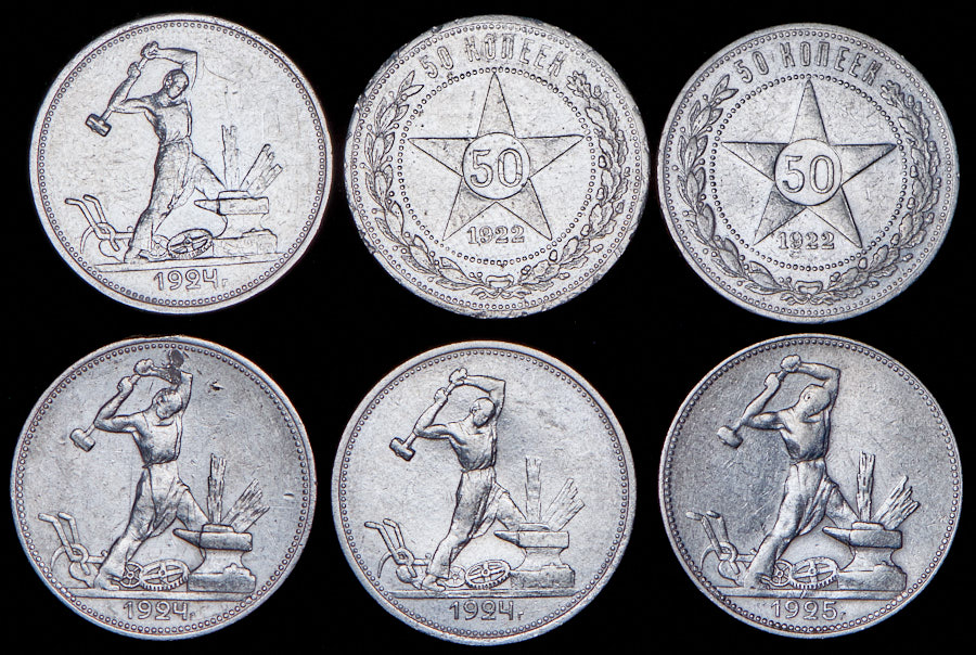 50 копеек 1922 (ПЛ) (2 шт.), Полтинник 1924 (ТР) (2 шт.), Полтинник 1924 (ПЛ), Полтинник 1925 (ТР).
