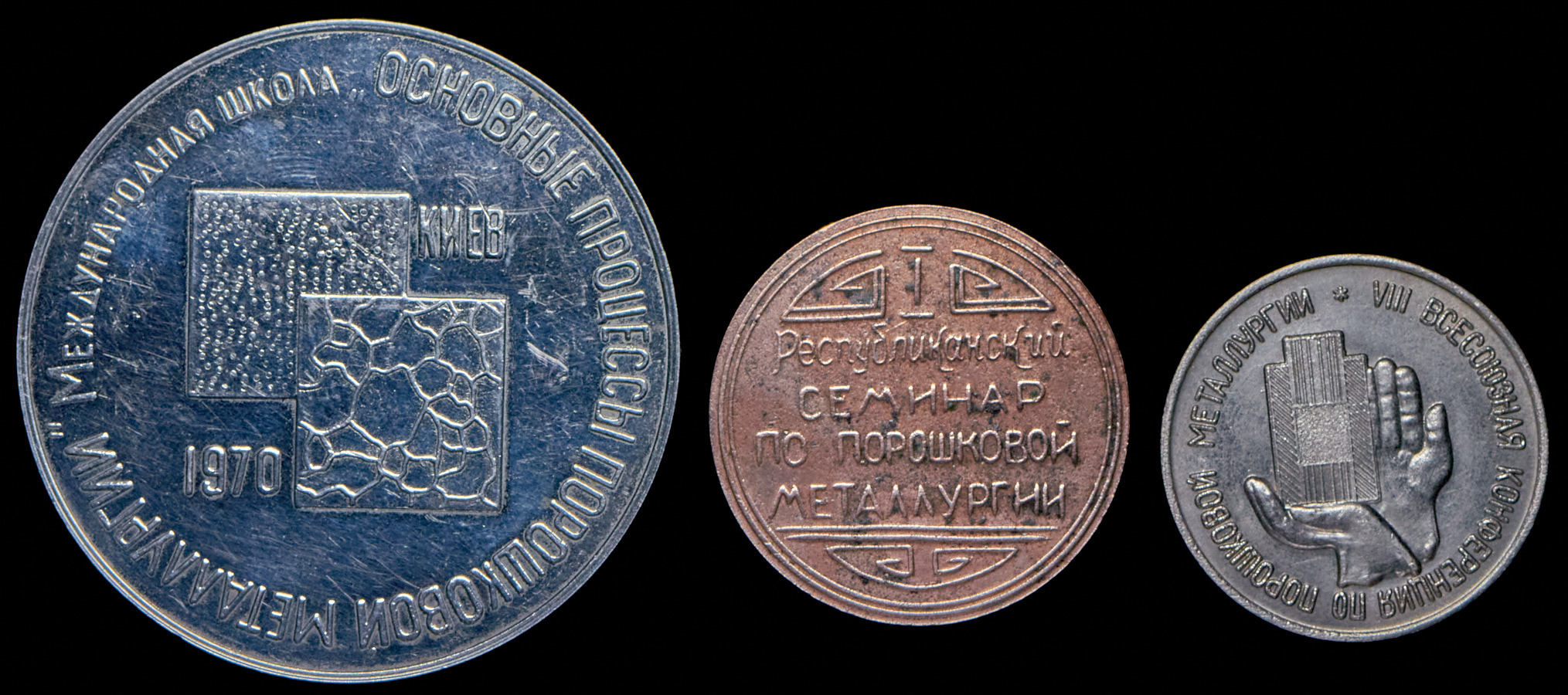 XF-AU. В набор вошли: 1. Медаль Минск, сентябрь 1966 год. VIII всесоюзная конференция по порошковой металлургии. Диаметр 34 мм.Нейзильбер (?). 2. Медаль Ташкент, 1969 год. Республиканский семинар по порошковой металлургии. Диметр 38 мм.Бронза (?). 3. Медаль Киев, 1970 год. Международная школа «Основные процессы порошковой металлургии. Диаметр 60 мм.Нейзильбер (?)