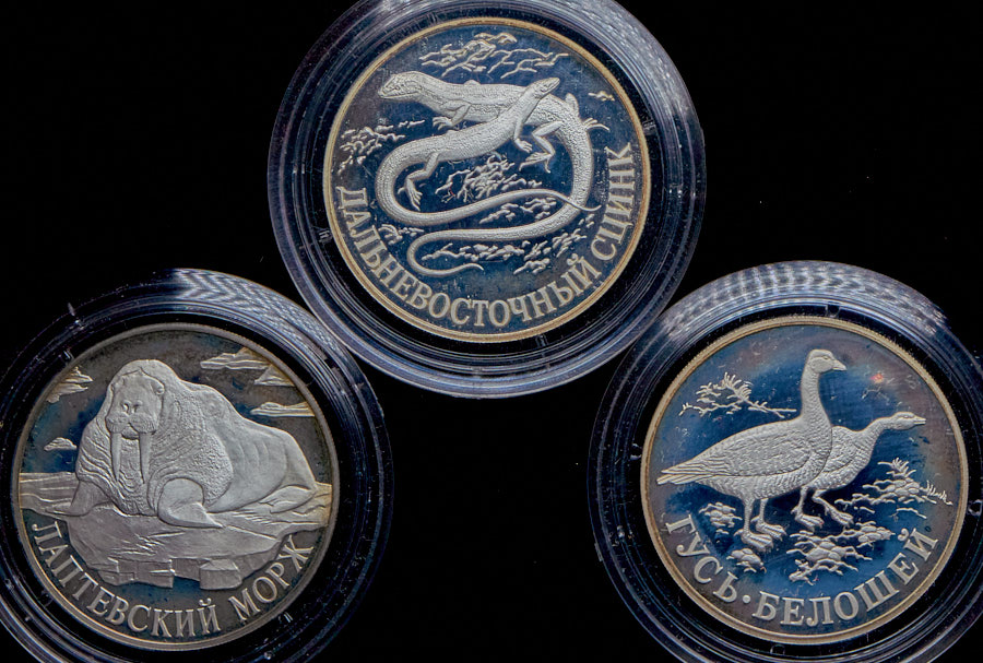 Серебро 900 пробы. Дальневосточный сцинк, Лаптевский морж, Гусь-белошей