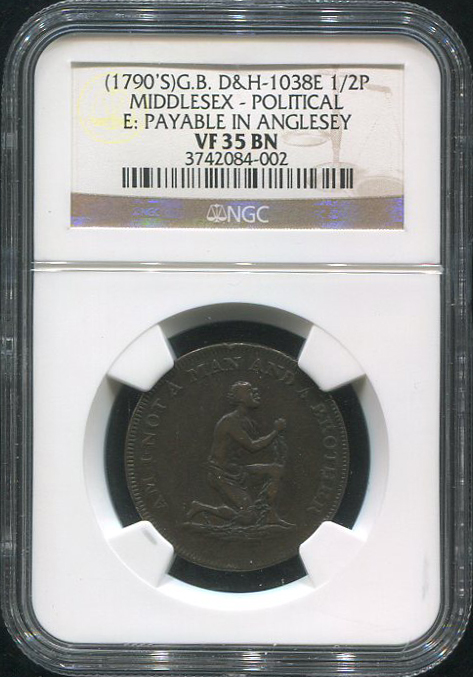 Данные жетоны с изображением раба-мужчины и фразой "Am I Not a Man & A Brother" (разве я не человек и брат) использовались Обществом по отмене работорговли, которое было основано в Великобритании в 1787 году.