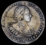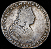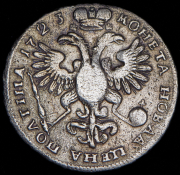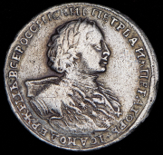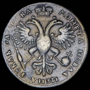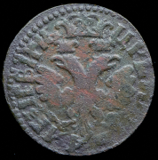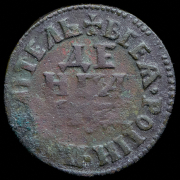 Кадашевский монетный двор. Портрет в наплечниках. Без инициала медальера. С пальмовой ветвью на груди. Над головой корона между точек.