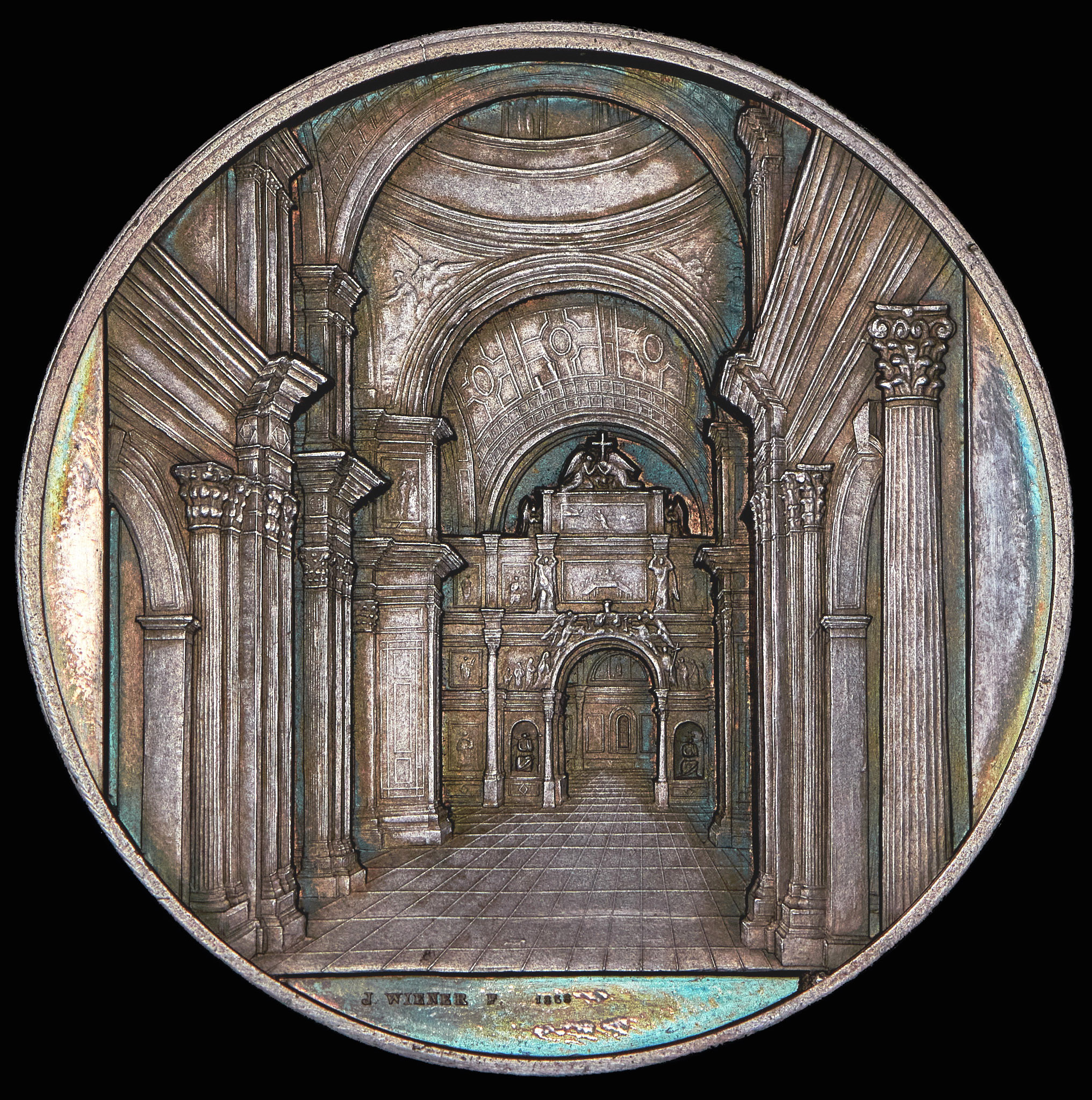 Крайне интересный высокохудожественный пример изумительной техники передачи объема в композиции, отсутствовавшей в русской медальерной школе. Глубина объектов дополнительно усиливается прозрачной зеркальностью полей, из которых выступает особым способом матированный рельеф.