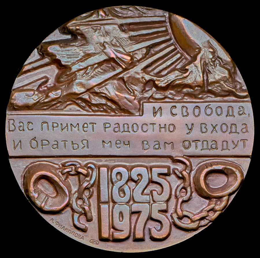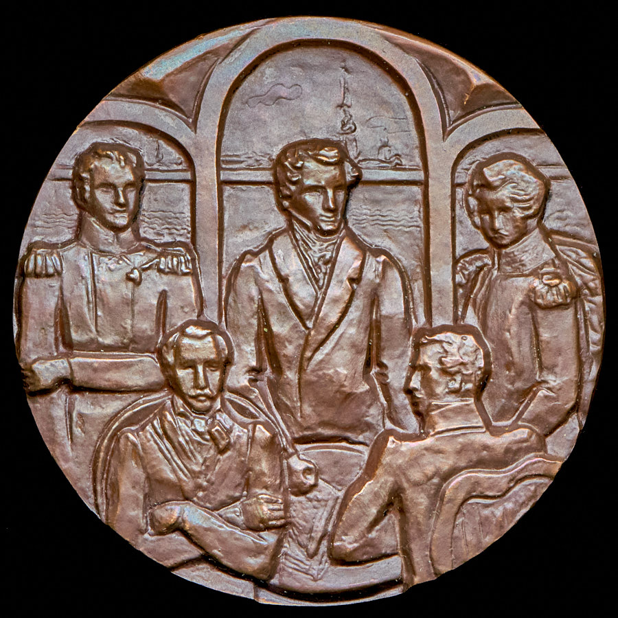 На аверсе портреты декабристов: К.Ф. Рылеев, П.И.Пестель, СИ. Муравьев-Апостол, М.П. Бестужев-Рюмин, П.Г. Каховский.