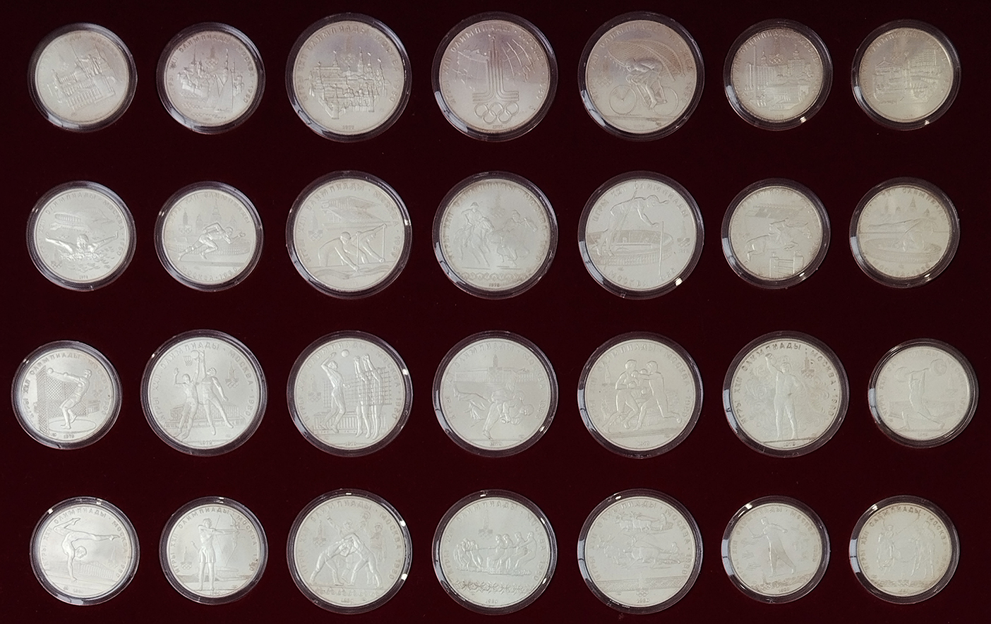 Полный комплект серебряных монет номиналом 10 и 5 рублей, выпущенных к XXII Олимпийским играм 1980 года в Москве. В подарочных коробках. Каждого номинала по 14 шт.